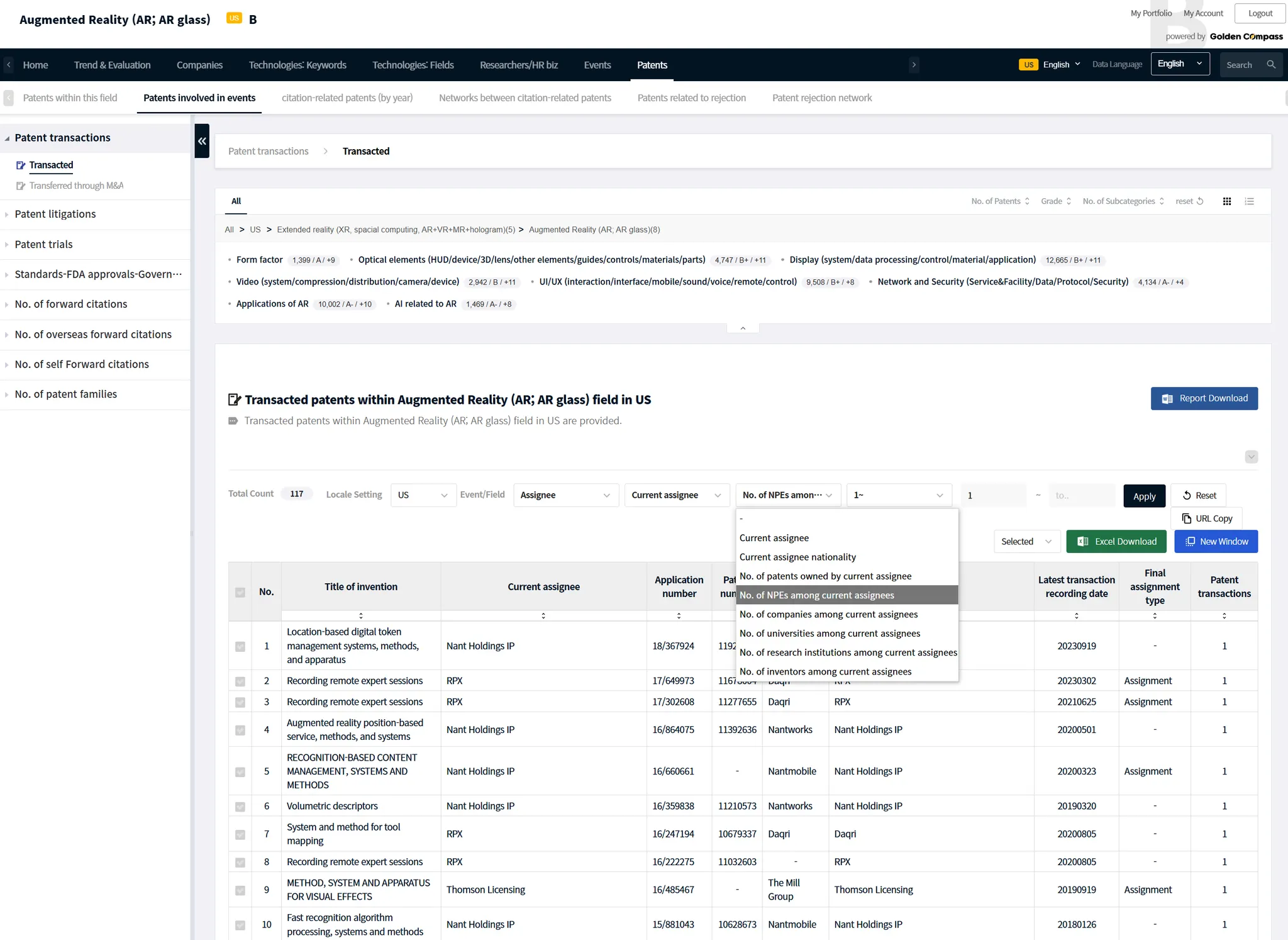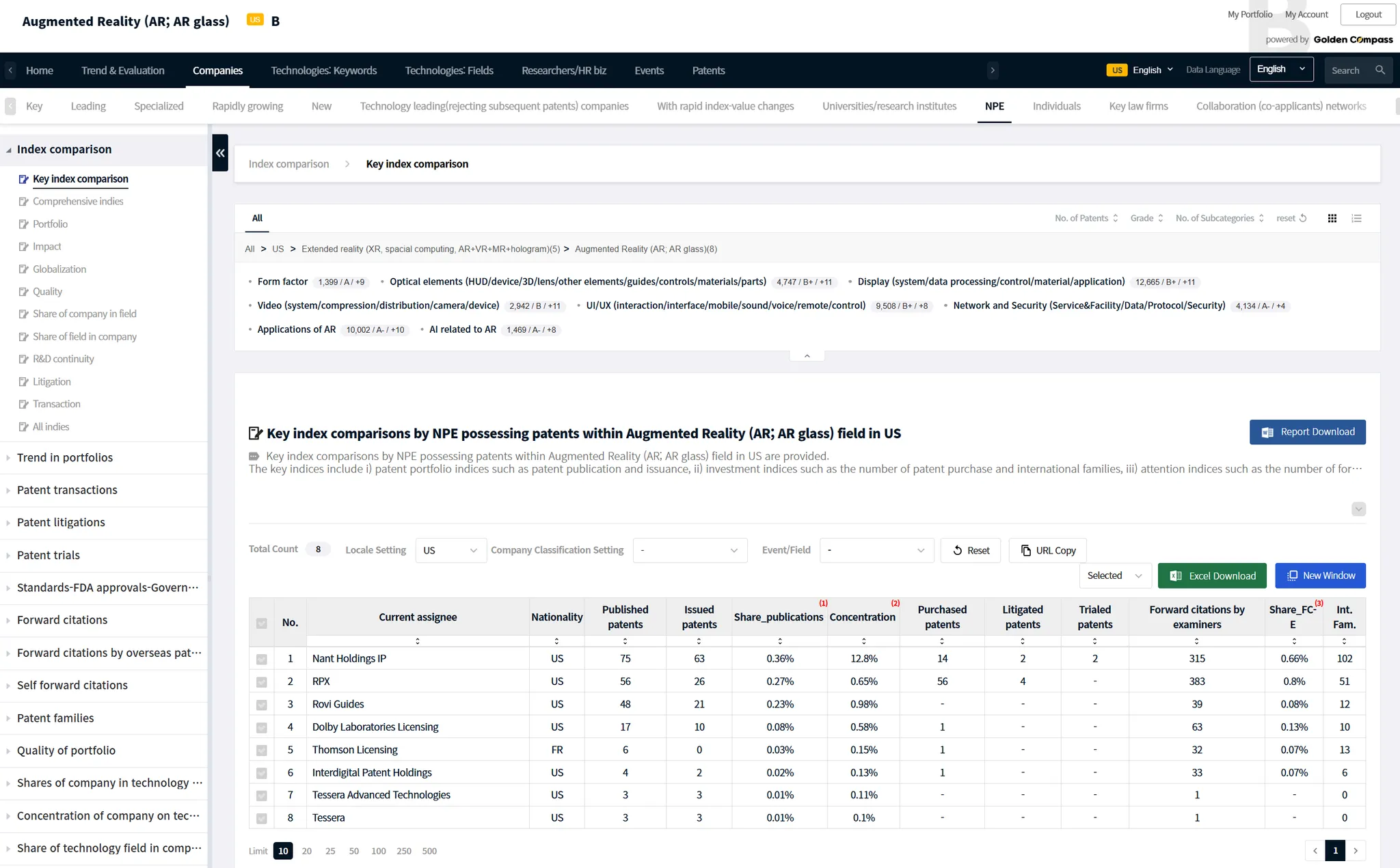PatentPia GoldenCompass treats NPEs as one of the types of right holders who have patents in possession related to field. Therefore, we include a service menu that analyzes the right holders of patents related to field by looking only at NPEs.