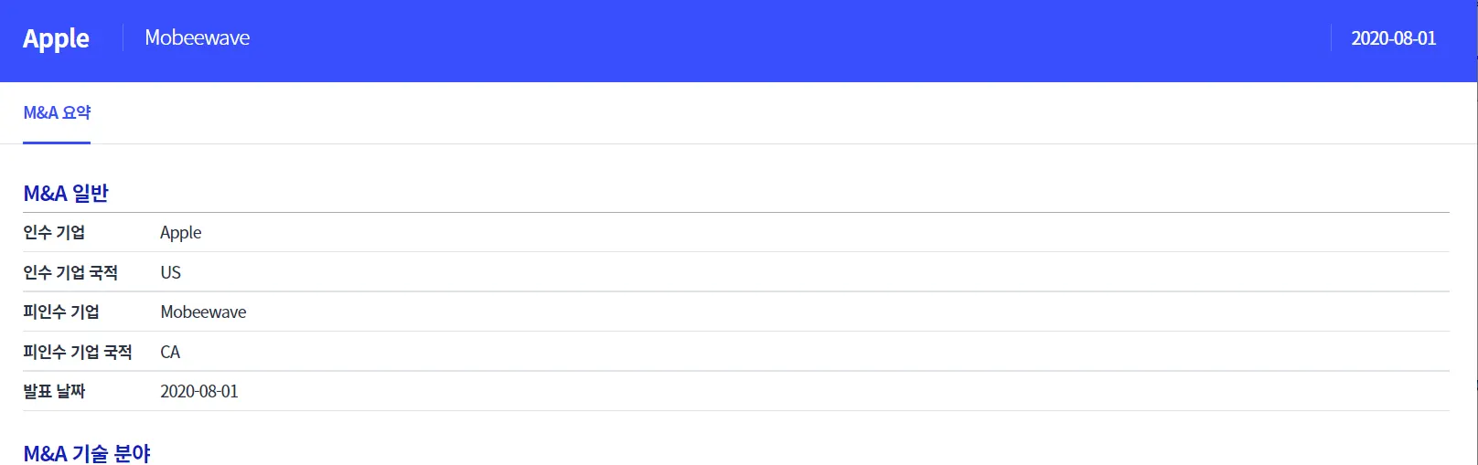 PatentPia의 M&A는 M&A된 기업(피인수 기업, acquiree)에 대한 분석/시각화 콘텐츠의 제공에 초점을 맞추고 있습니다. 따라서, M&A에 대한 금융 시장 관점의 중요 정보(deal 금액, deal 종료 여부, deal 조건 등)에 대해서는 취급하지 않습니다. 금융 시장적 관점에서의 M&A 정보는 다른 전문적인 서비스를 참고하시기 바랍니다.