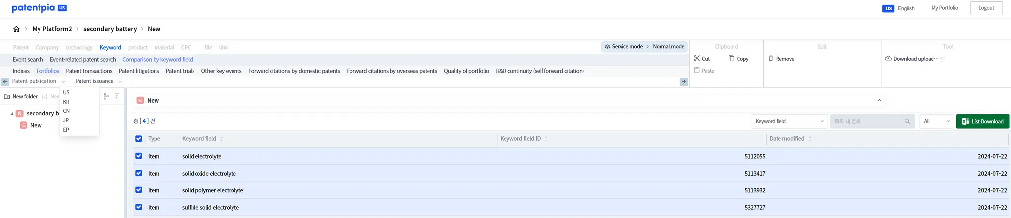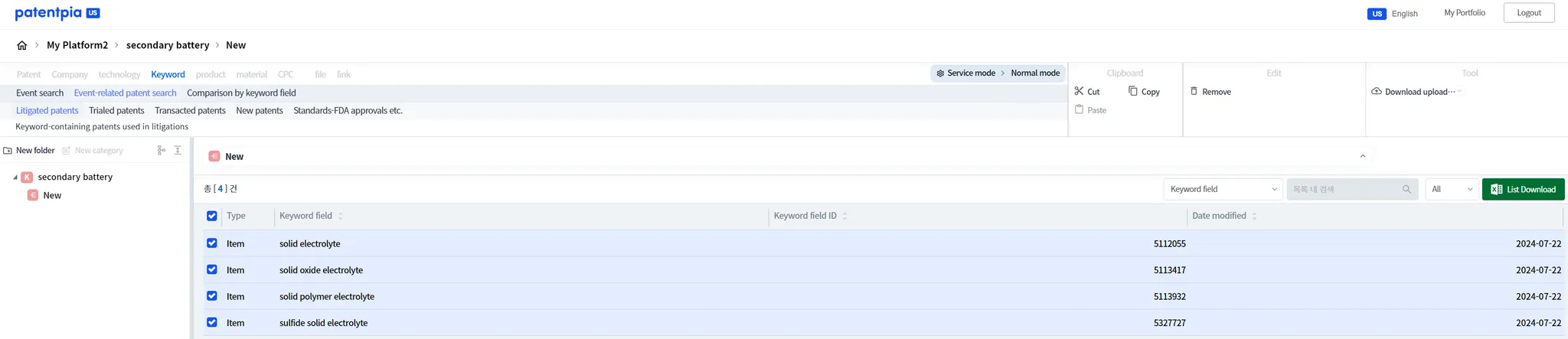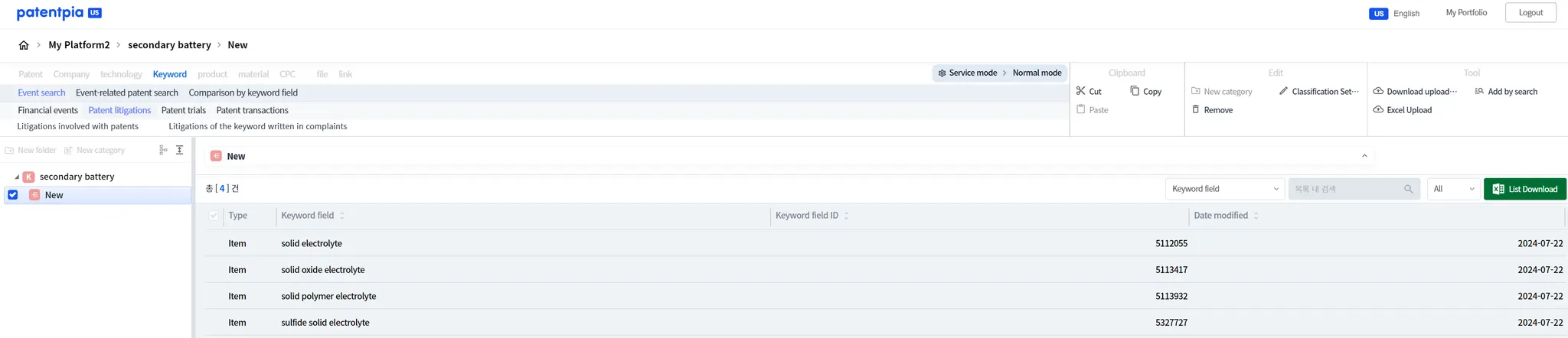 The following is the result of uploading a list of keywords related to secondary battery issues to My platform, which illustrates the administrative features of My platform.