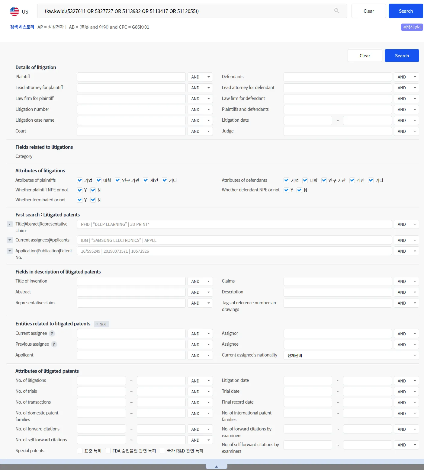 Event search services such as i) Search for patents used in litigation (enter 1 or more in the Patent Attribute->No. of litigations field), ii) Search for patents used in trials (enter 1 or more in the No. of judges field), and iii) Search for patents in transactions (enter 1 or more in the No. of assignments field) are provided, using the list of selected companies in My platform as the search condition of PatentPia Search. [For more information on PatentPia Search's events occurrence patent search, see [Link].
