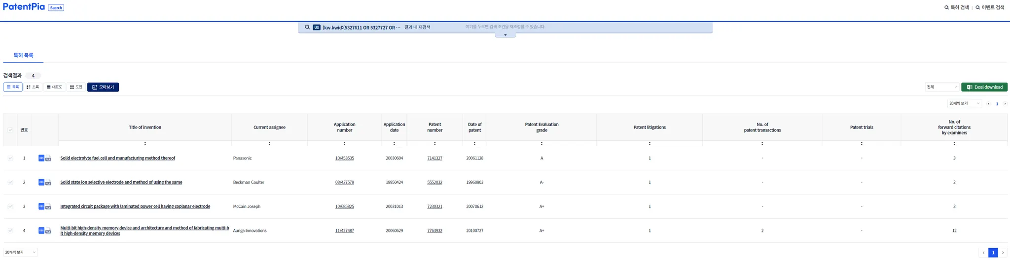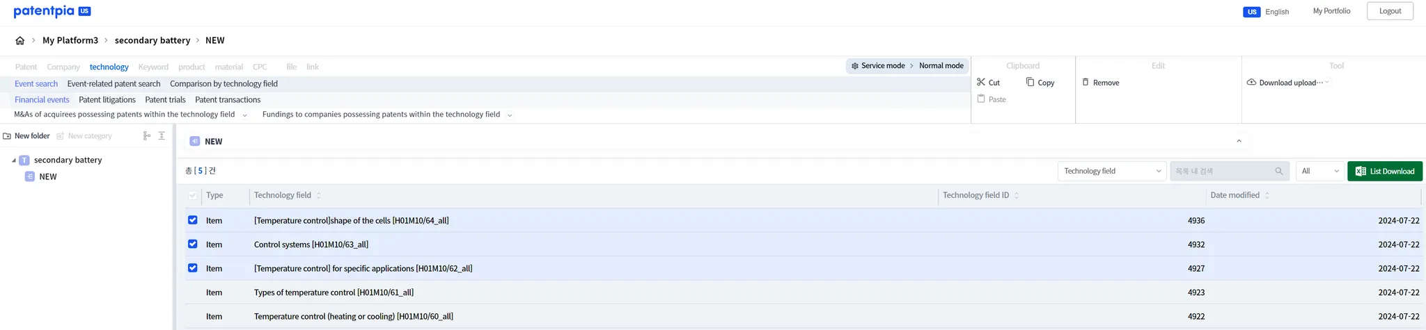In the technology list, if multiple technologies are selected, you can receive contents services such as i) technology comparison analysis, ii) events patent search, and iii) events search with the selected technologies.