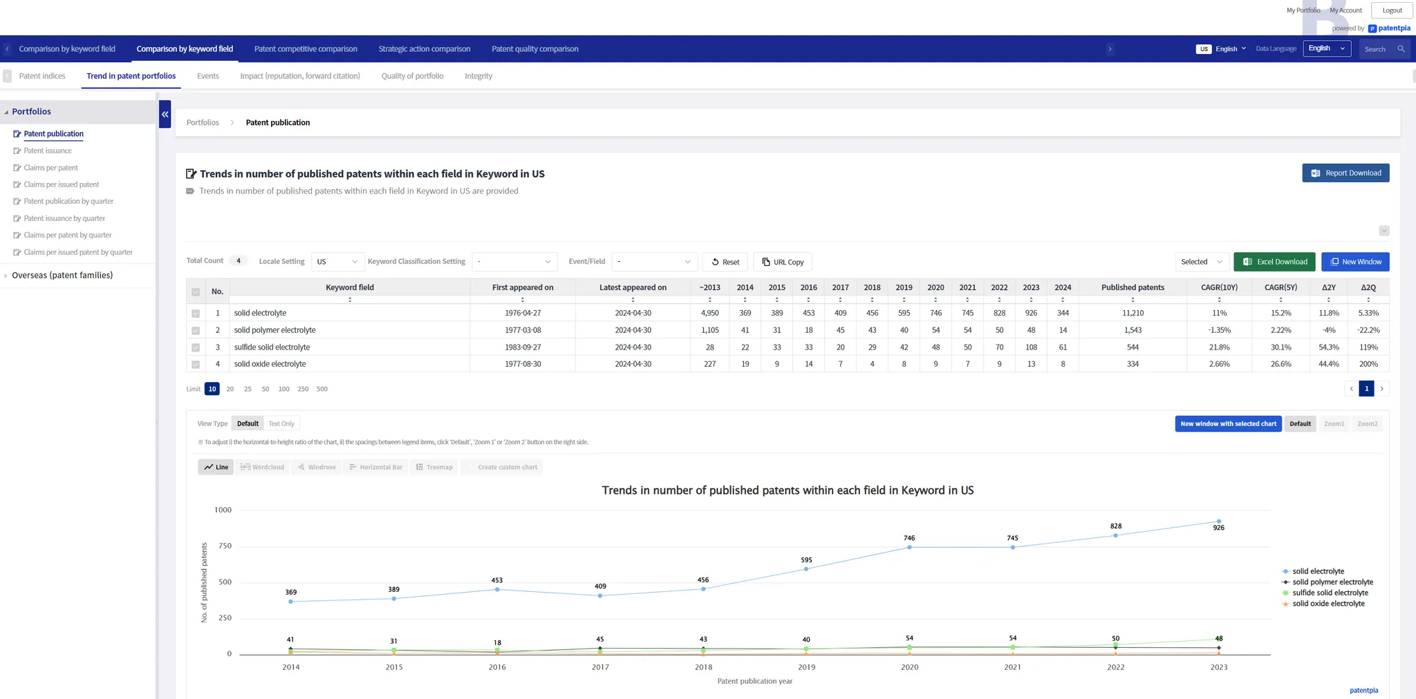 Dozens of comparison analysis contents are provided through GoldenCompass using the list of selected technologies on My platform. On the GoldenCompass page, you can i) select various comparison analysis menus, ii) generate & download reports, and iii) download data as an excel file. For detailed comparison analysis contents, please refer to [Link].