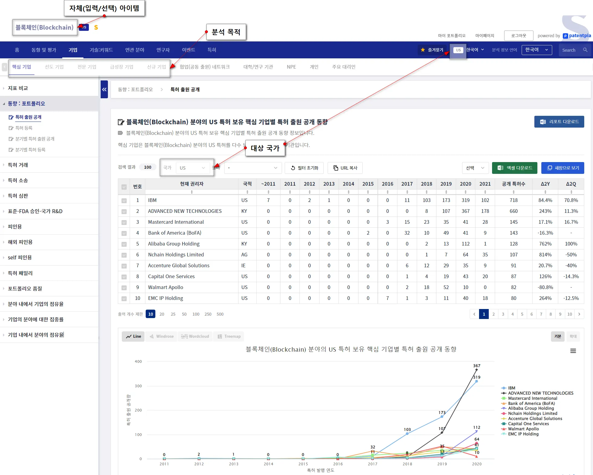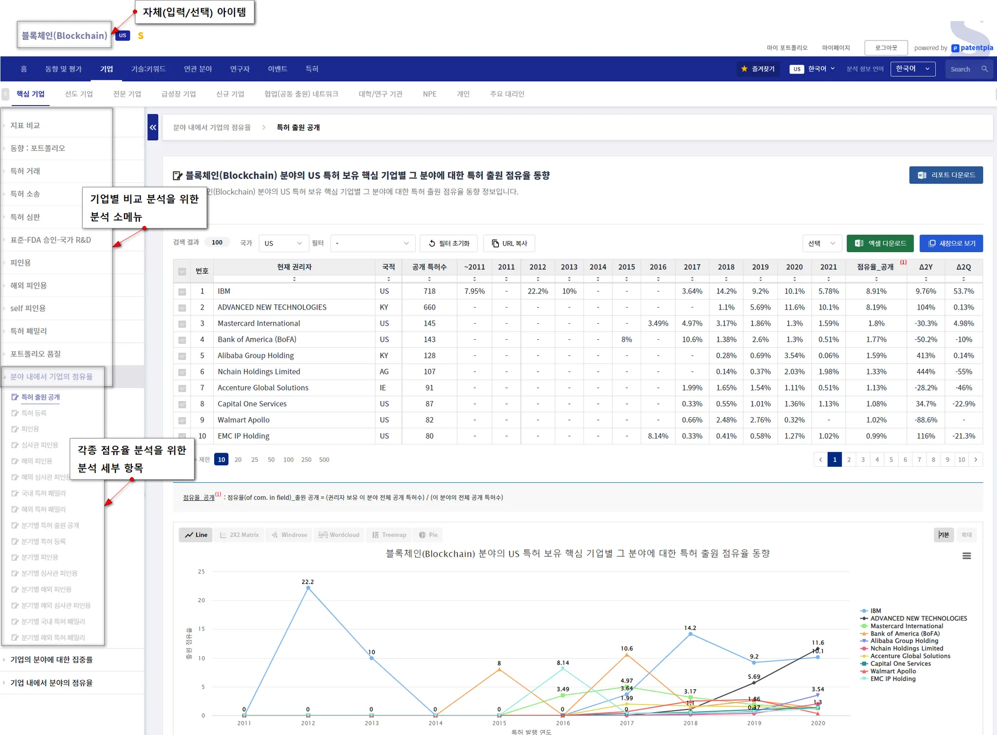 "blockchain"에 대한 기업별 US 특허 점유율 분석
