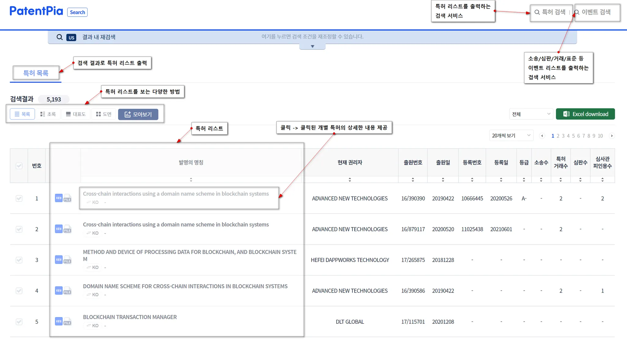 A : PatentPia Search에서는 기존의 특허 검색 서비스과 동등한 검색 서비스를 제공합니다. 물론, 기존의 특허 검색에서는 제공하지 않는 차별화된 특허 검색(소송/심판/거래/표준...등의 이벤트 및 이벤트에 사용된 특허나, 피인용 급등 특허 등과 같은 특별한 특허 검색 등) 서비스를 제공합니다.
