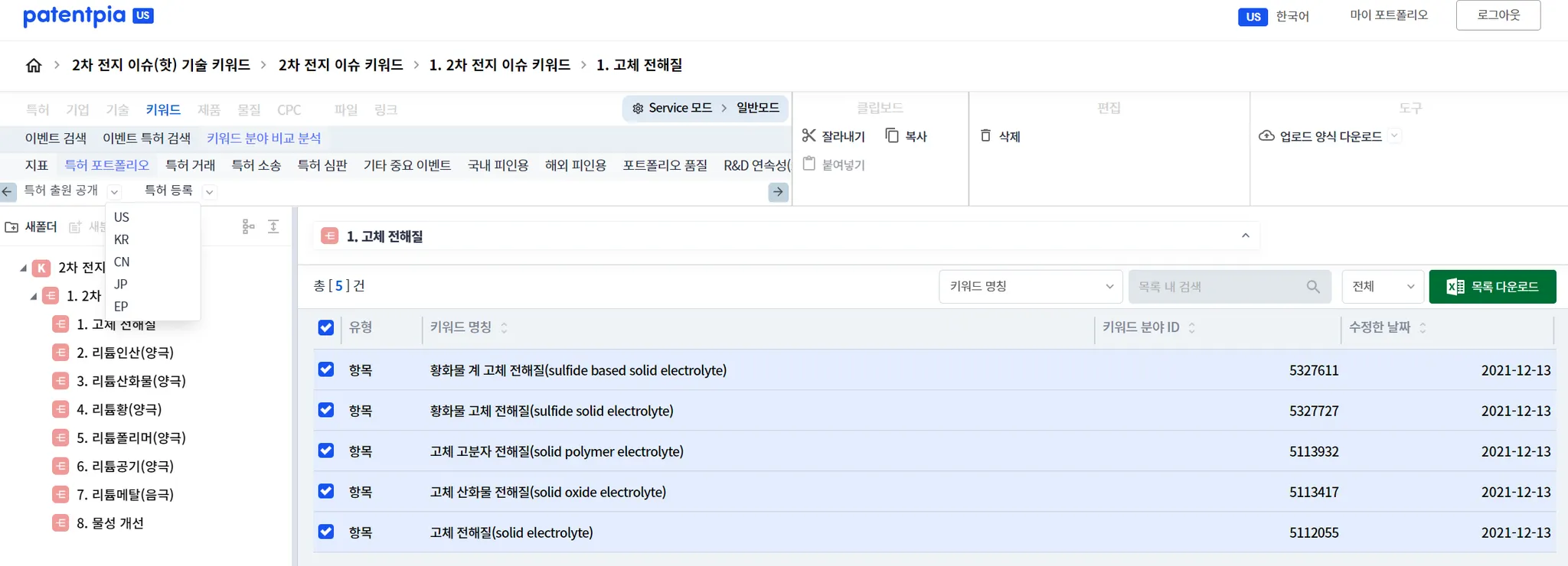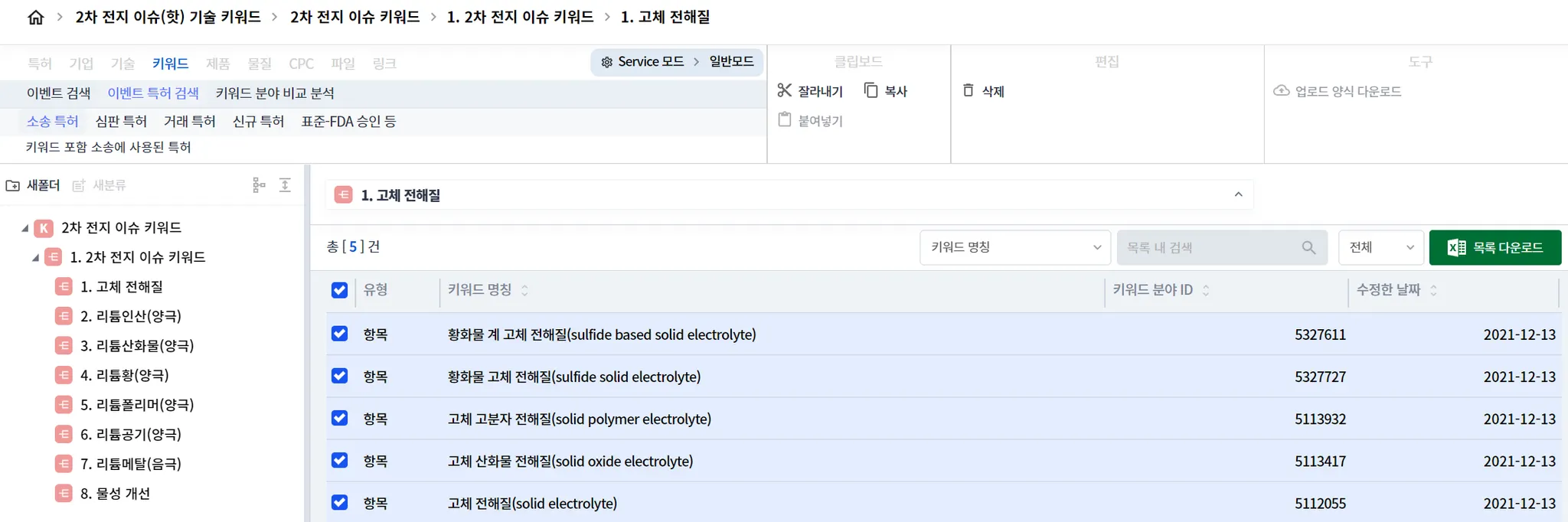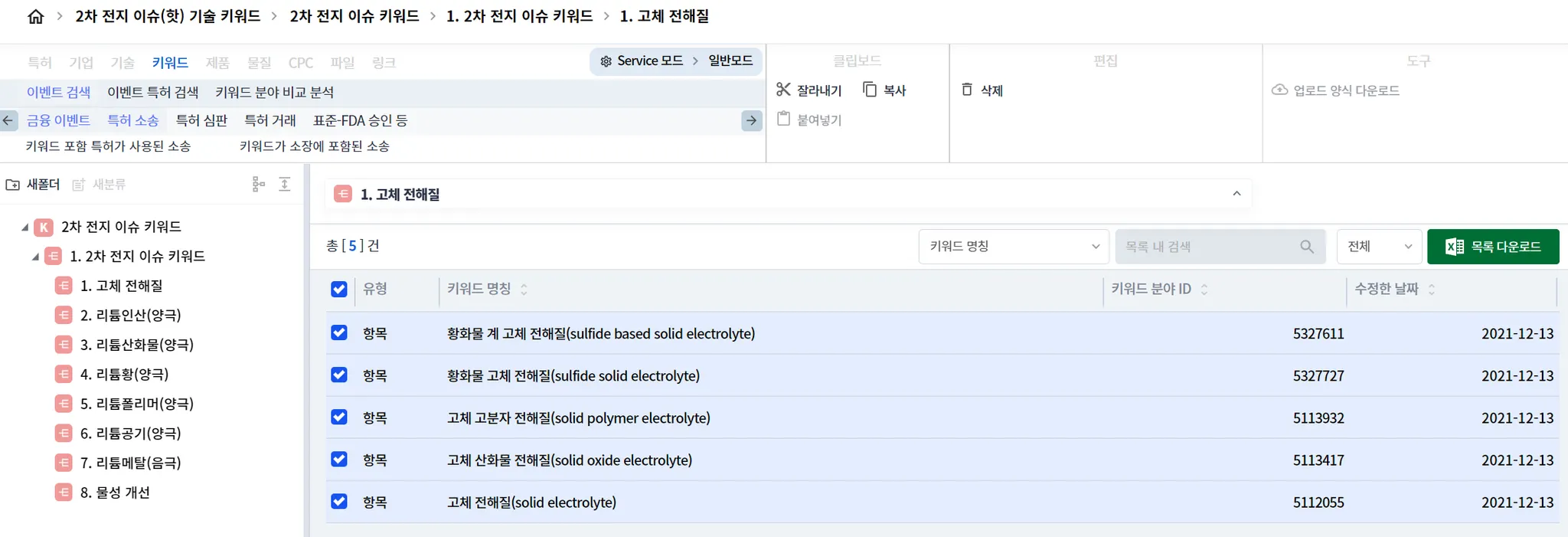 2차 전지 관련 이슈 키워드 리스트를 My platform에 업로드한 결과로 My platform의 관리 기능을 설명합니다.
