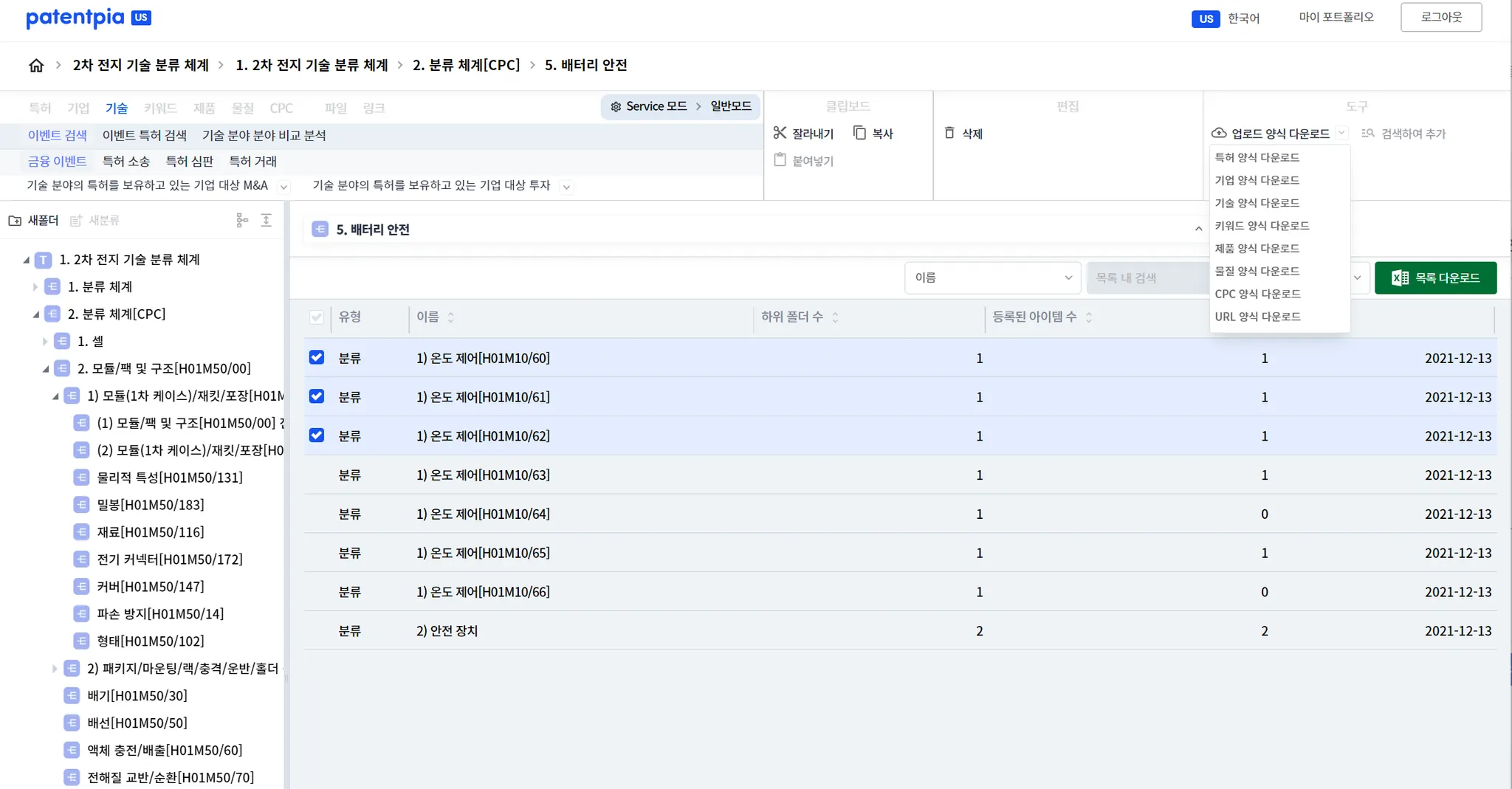 기술 리스트에서, 기술이 여러 개 선택되면, 선택된 기술로, i) 기술 비교 분석, ii) 이벤트 특허 검색, iii) 이벤트 검색 등의 콘텐츠 서비스를 받을 수 있습니다.