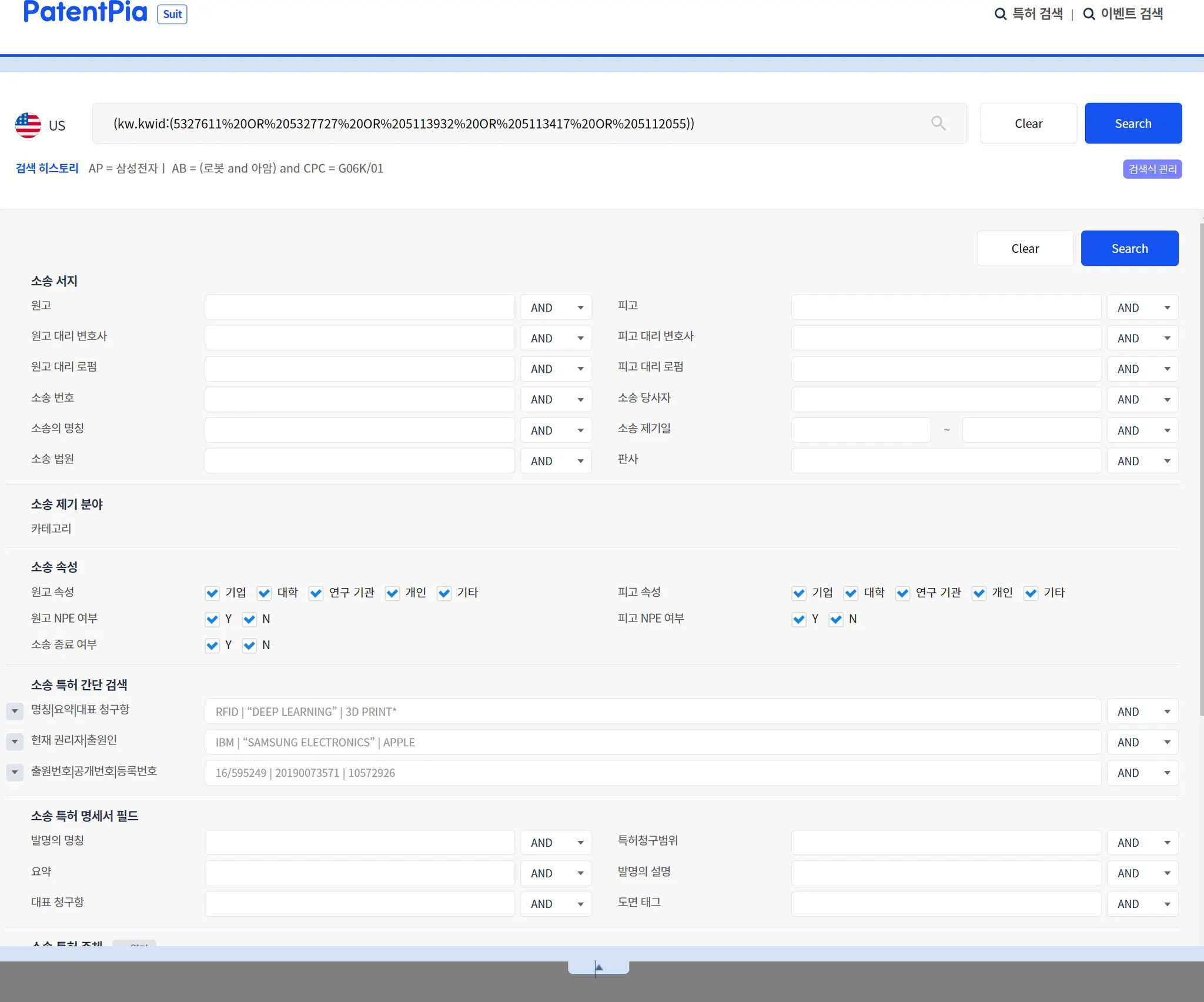 물론, PatentPia Search에서는 다양한 검색 조건을 부가할 수 있습니다. 위 화면에서 상단 영역에 있는 역삼각형 아이콘을 클릭하면, 검색 조건이 입력된 다음과 같은 화면이 나타납니다.