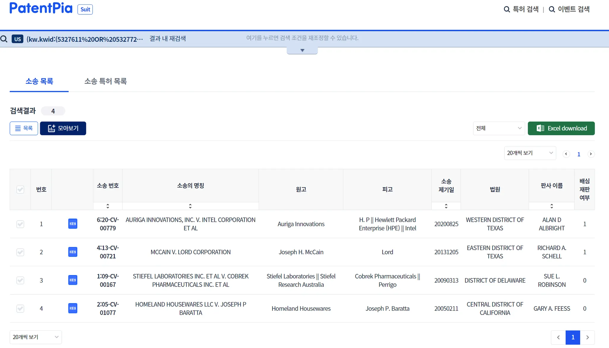 My platform에서 선택된 기술 리스트를 PatentPia Search의 검색 조건으로 사용하는 i) 특허 소송, ii) 특허 심판, iii) 특허 거래 등과 같은 이벤트 검색 서비스가 제공됩니다. PatentPia Search의 이벤트 검색에 대한 상세한 내용은 [Link]를 참조하세요.