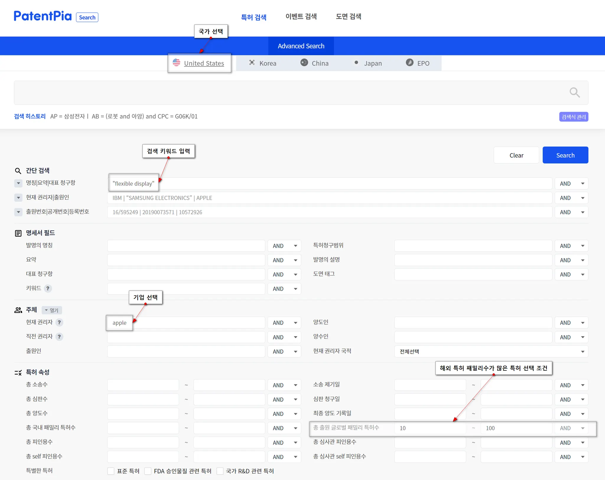 한편, PatentPia Search에서 특허를 검색할 때, 검색 조건으로 "해외 특허 패밀리수"에 값을 넣으면 해외 특허 패밀리가 많은 특허가 검색됩니다.