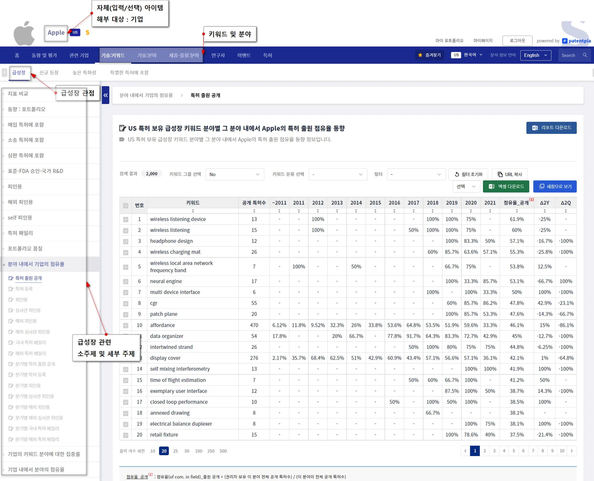 Apple을 관심 기업의 예시로, PatentPia GoldenCompass를 활용한 경쟁사/기업 해부 콘텐츠를 제공합니다. 위 활용 지도의 각 항목에 결합되어 있는 사슬(링크) 표시를 클릭하면, 예시 화면이 새 창으로 열립니다.