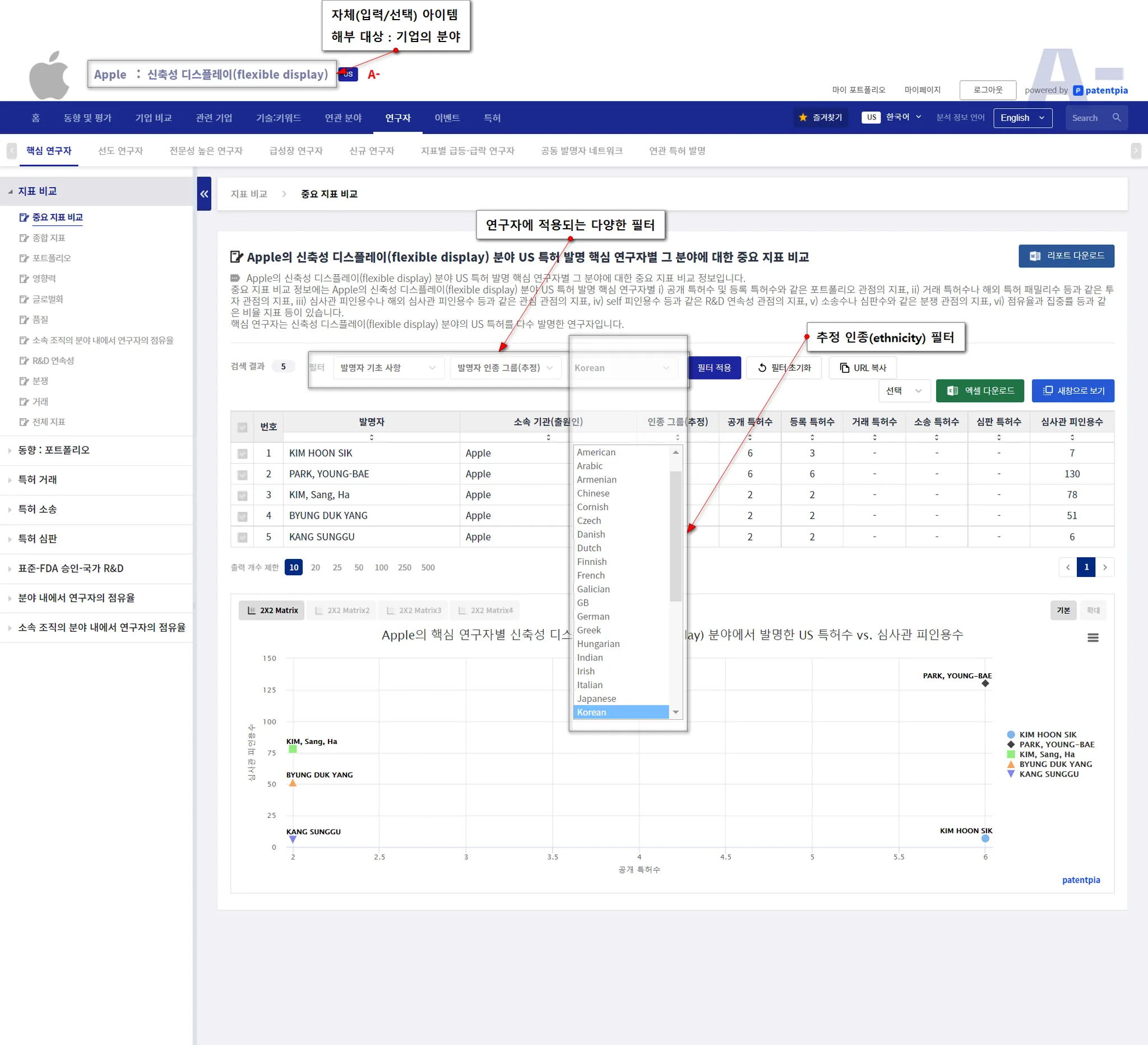 한편, 연구 인적 자산 중 특정한 인종 그룹에 속하는 연구 인적 자산을 발굴할 필요성(예, HR 목적 등)이 있을 수 있습니다. 이 경우, 연구자에 대한 필터를 사용합니다.