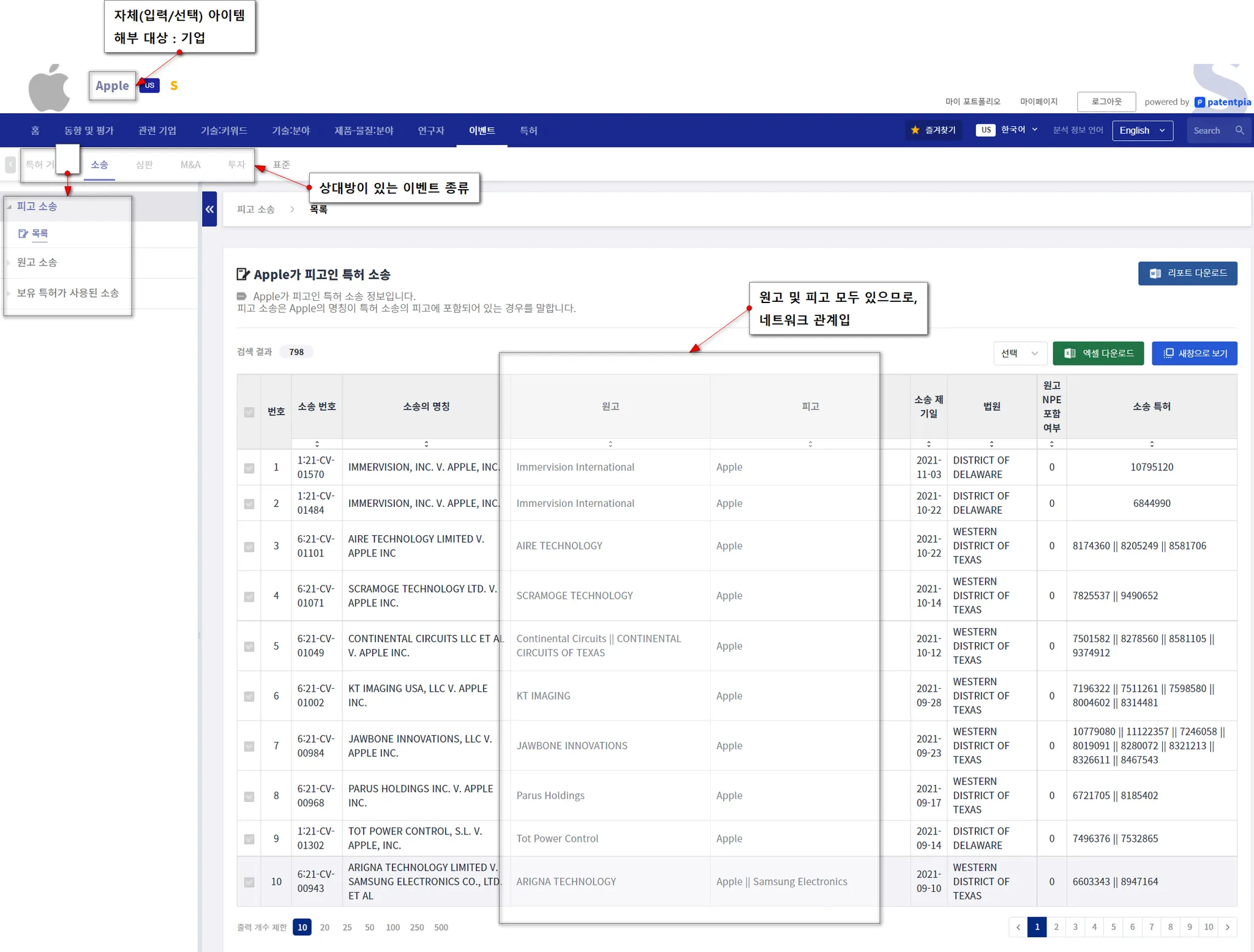 소송이나 (당사자/상대방이 있는)심판에 사용된 특허는 특히 중요합니다. 특허 소송은 엄청난 규모의 총비용(법률 비용, 손실, 합의금, 배상금 등)이 동반되고, 시장에서의 사활이 걸린 이벤트입니다. 이에 따라, 제품/서비스의 시장 규모, 기업의 실시 규모 등이 동반되지 않으면 발생하지 않는 것이 일반적입니다. 이러한 환경에서도 특허 소송이 발생한다면, 그 소송에 사용된 특허는 핵심 특허 중 핵심 특허가 됩니다.