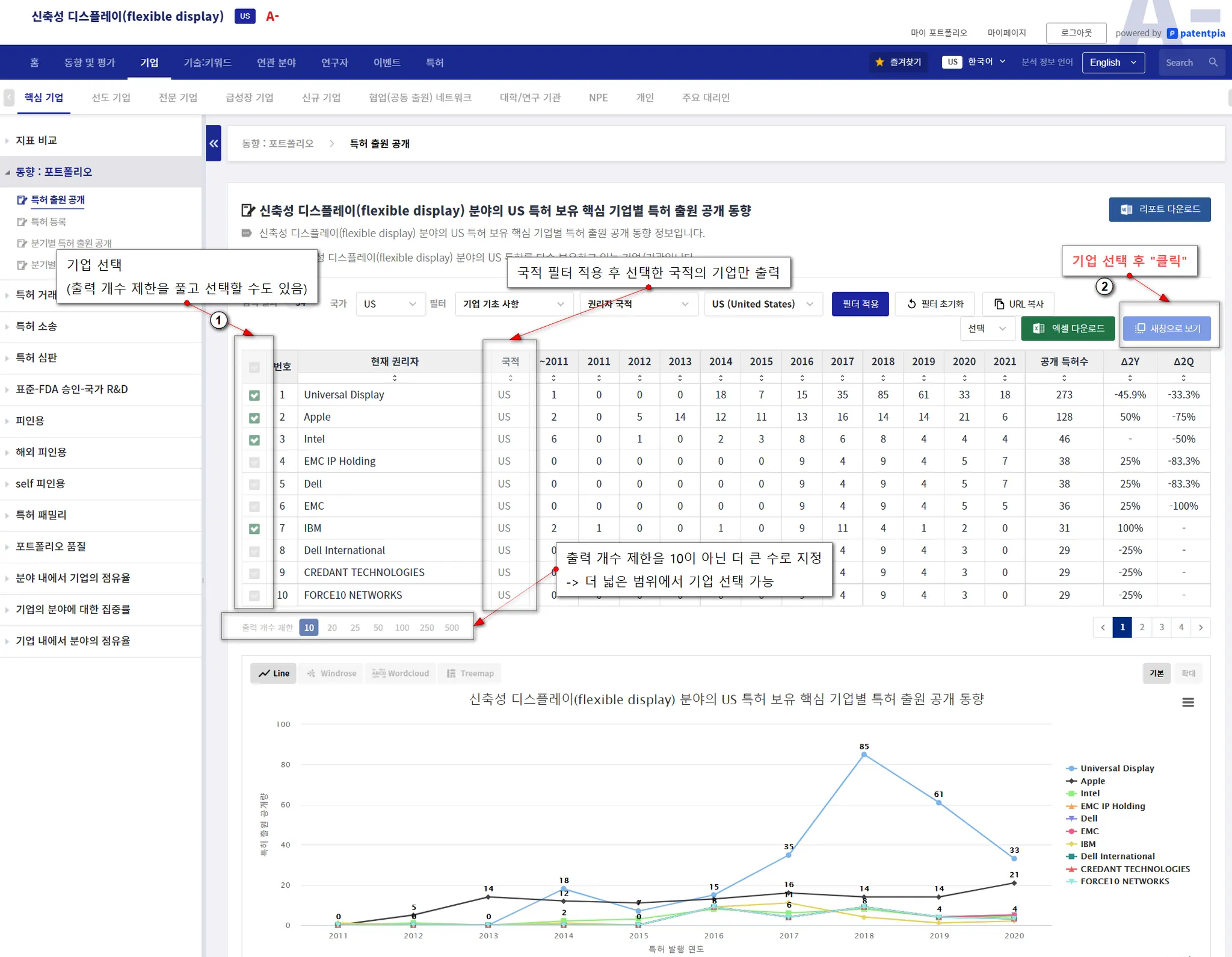 변경된 분석 결과에 따라, 차트 등에서도 선택된 국적의 기업만이 나타납니다. 아울러, 리포트 등도 선택된 국적의 기업만으로 구성됩니다.