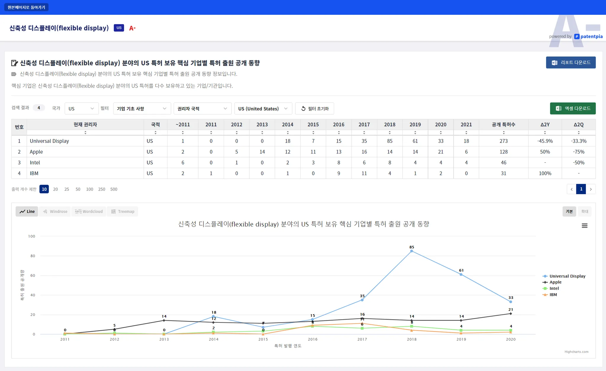 Apple을 관심 기업으로, Apple의 flexible display를 Apple의 관심 키워드 예시로, PatentPia GoldenCompass를 활용한 경쟁사/기업 해부 콘텐츠를 제공합니다. 위 활용 지도의 각 항목에 결합되어 있는 사슬(링크) 표시를 클릭하면, 예시 화면이 새 창으로 열립니다.