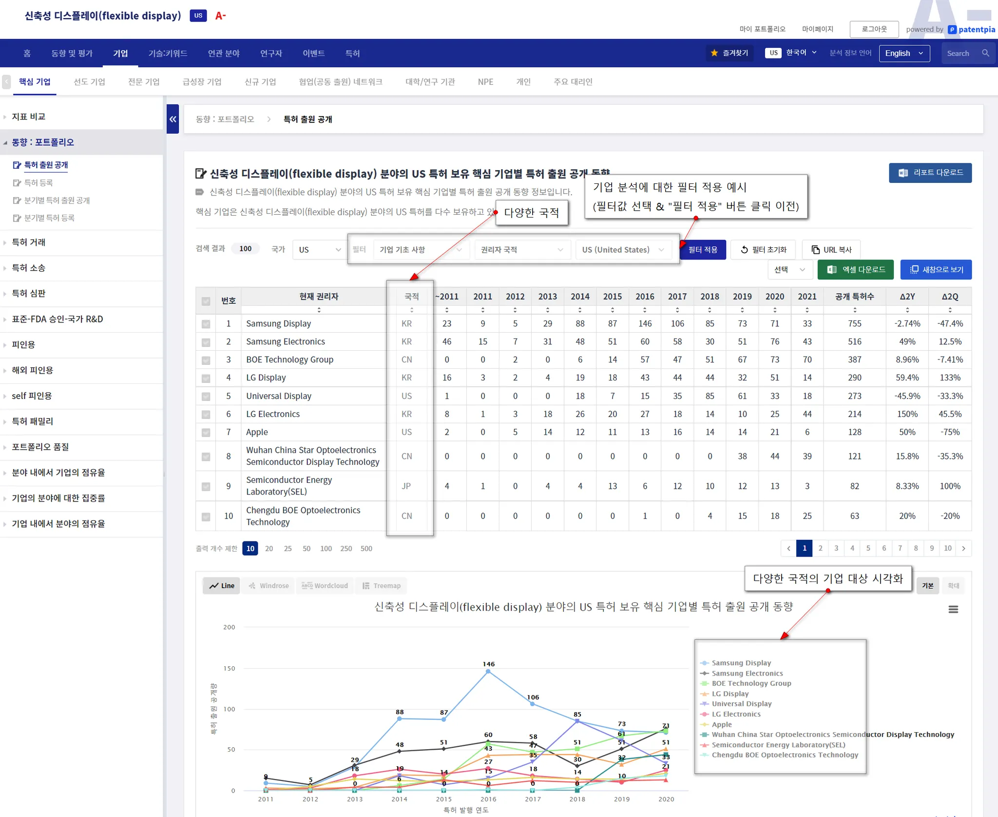 기업 분석 화면에서, 필터 → 기업 기초 사항 → 권리자 국적 → 나열된 국적 중 1개 선택(예, United States) → "필터 적용" 버튼 클릭의 순서로 입력하면, 선택된 국적을 기준으로 필터링이 적용됩니다.