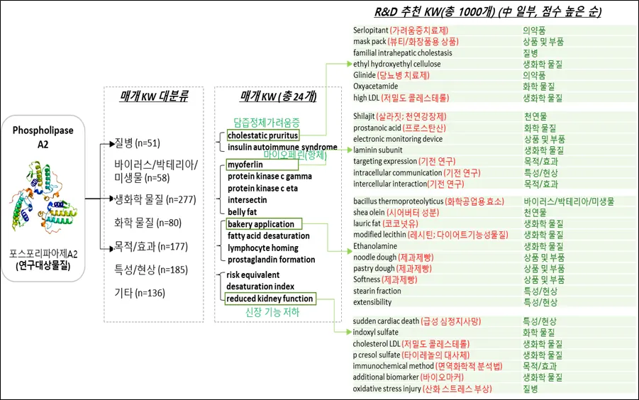 Input이 질병인 경우에는 예시적으로, i) 이 질병에 적용/활용/사용 가능할 수 있는 의약 물질/유전자/효소/천연 물질, ii) 이 질병과 연관된 질병/질환/증상/마커, iii) 이 질병에 대한 신규 컨셉/특성/원인/목적/효과 등이 기획 목표가 될 수 있습니다.