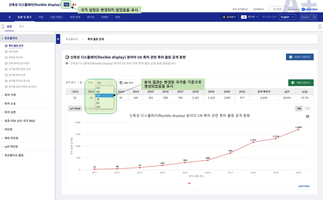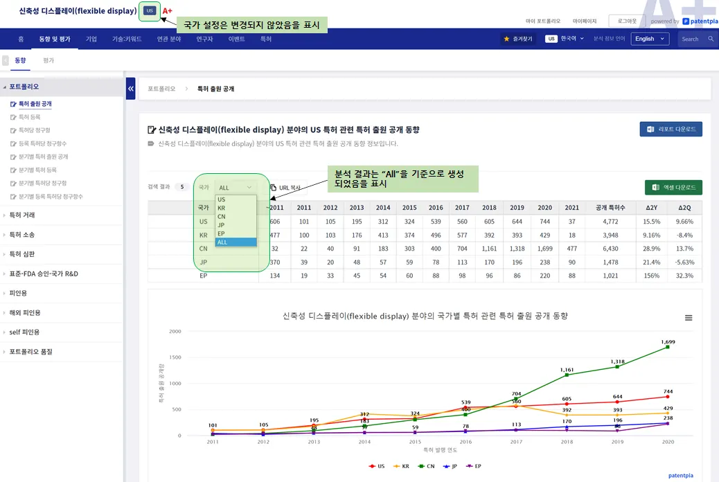 PatentPia GoldenCompass의 모든 분석 콘텐츠는 국가(특허청) 단위로 제공됩니다. 따라서, 기준이 되는 국가(특허청)을 지정해야 하며, 지정된 국가를 기준으로 모든 콘텐츠가 제공됩니다. 물론, 국가(특허청) 간의 비교 분석 콘텐츠가 제공되는 경우도 있습니다.