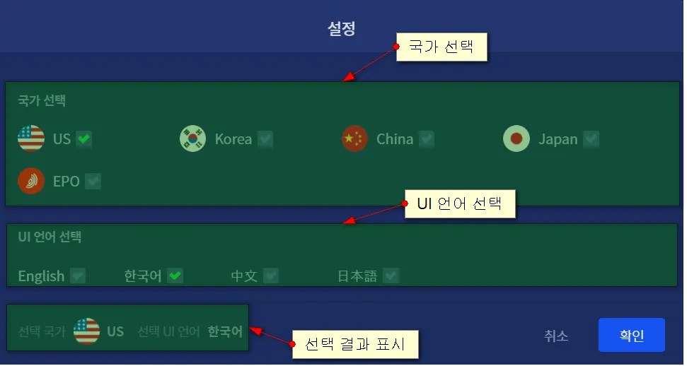 (주의)"국가 및 언어 설정"에서 국가를 변경하면, 분석 대상 국가가 완전히 변경(화면 1에서 국가 2에 대한 분석 결과를 제공하는 화면 2로 완전히 이동)됩니다. 다시 국가1로 복귀하려면 "국가 및 언어 설정"에서 다시 국가 1을 선택해 주어야 합니다.