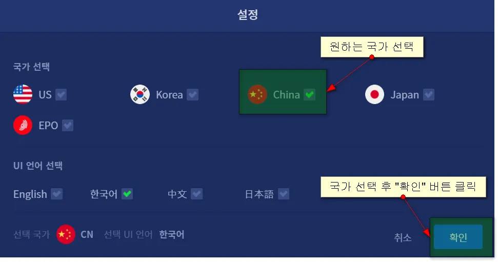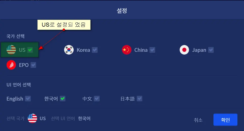 분석하기를 원하는 국가(특허청)를 선택합니다. default는 "US"로 설정되어 있습니다.