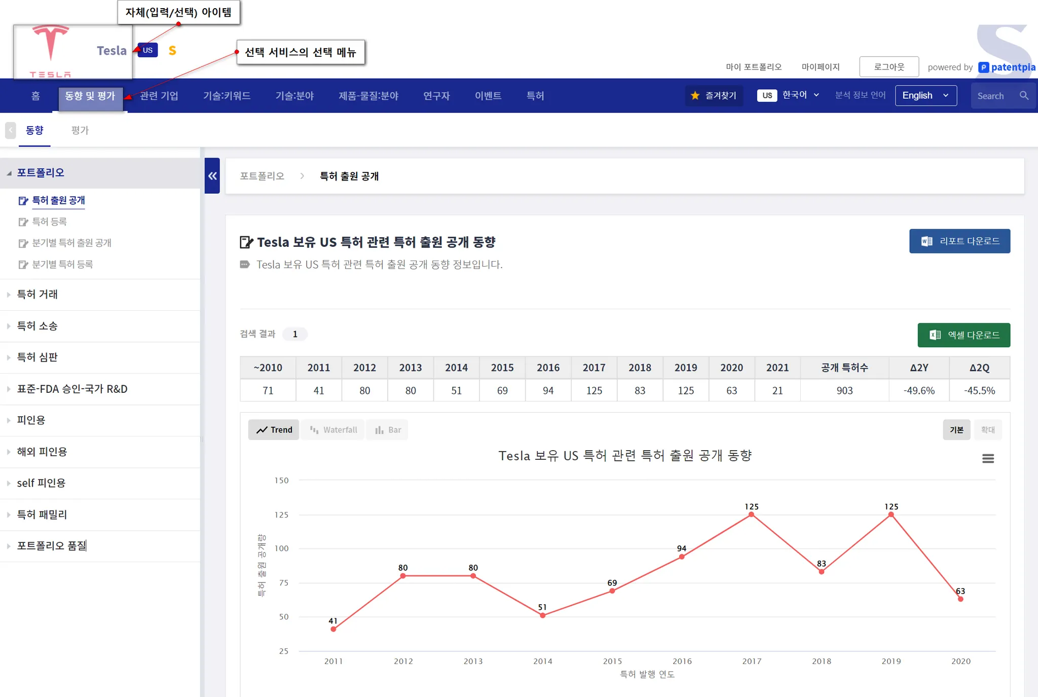 기업을 1개 선택하고, GoldenCompass(GC) 서비스의 "동향 및 평가"를 선택합니다. "동향 및 평가" 메뉴의 하위 메뉴인 "포트폴리오"를 선택하고, (분석 타겟 국가를 선택하면), 선택된 기업에 대한 분석 콘텐츠가 제공됩니다.