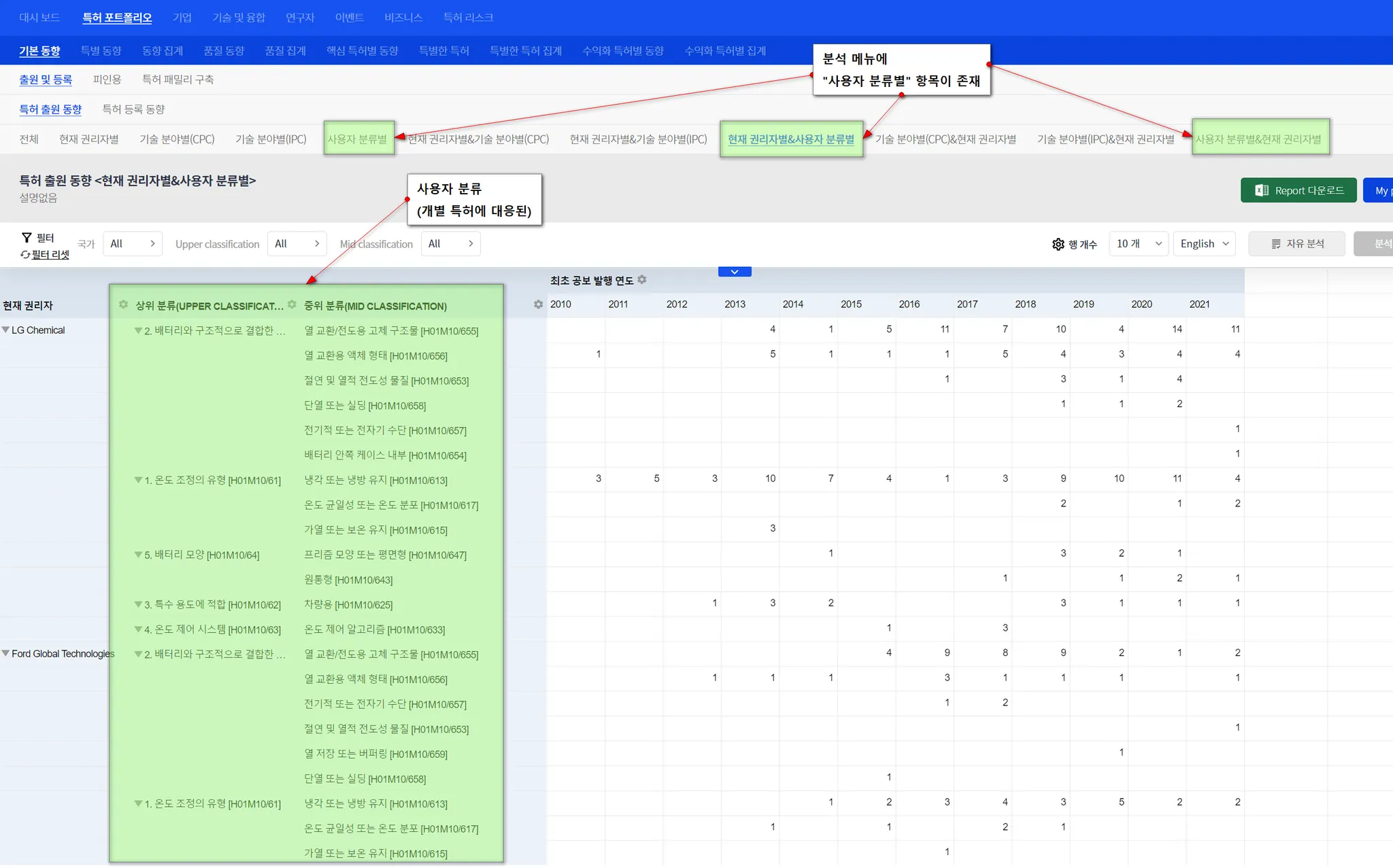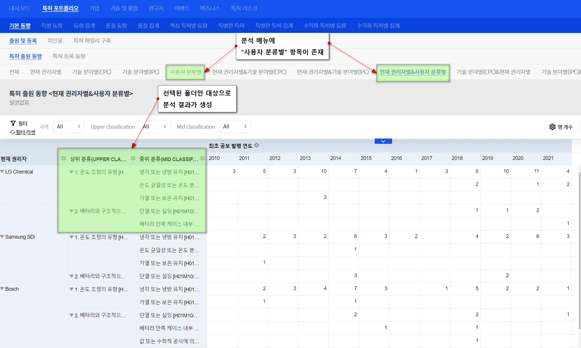 Analytics의 특허 분석 메뉴에, “사용자 분류별”이 포함된 메뉴가 다수 있음을 할 수 있습니다. 특허 분석 결과가 사용자 분류별로 집계됩니다.