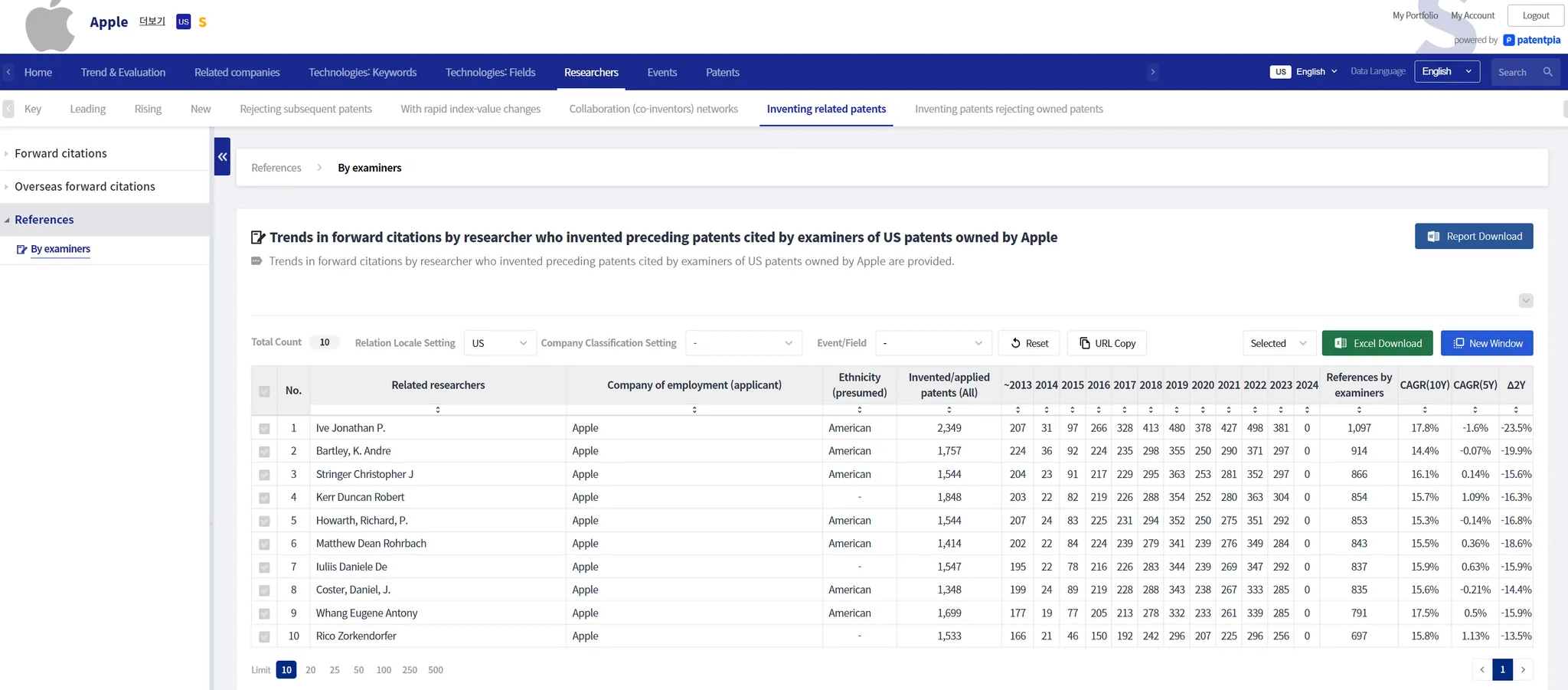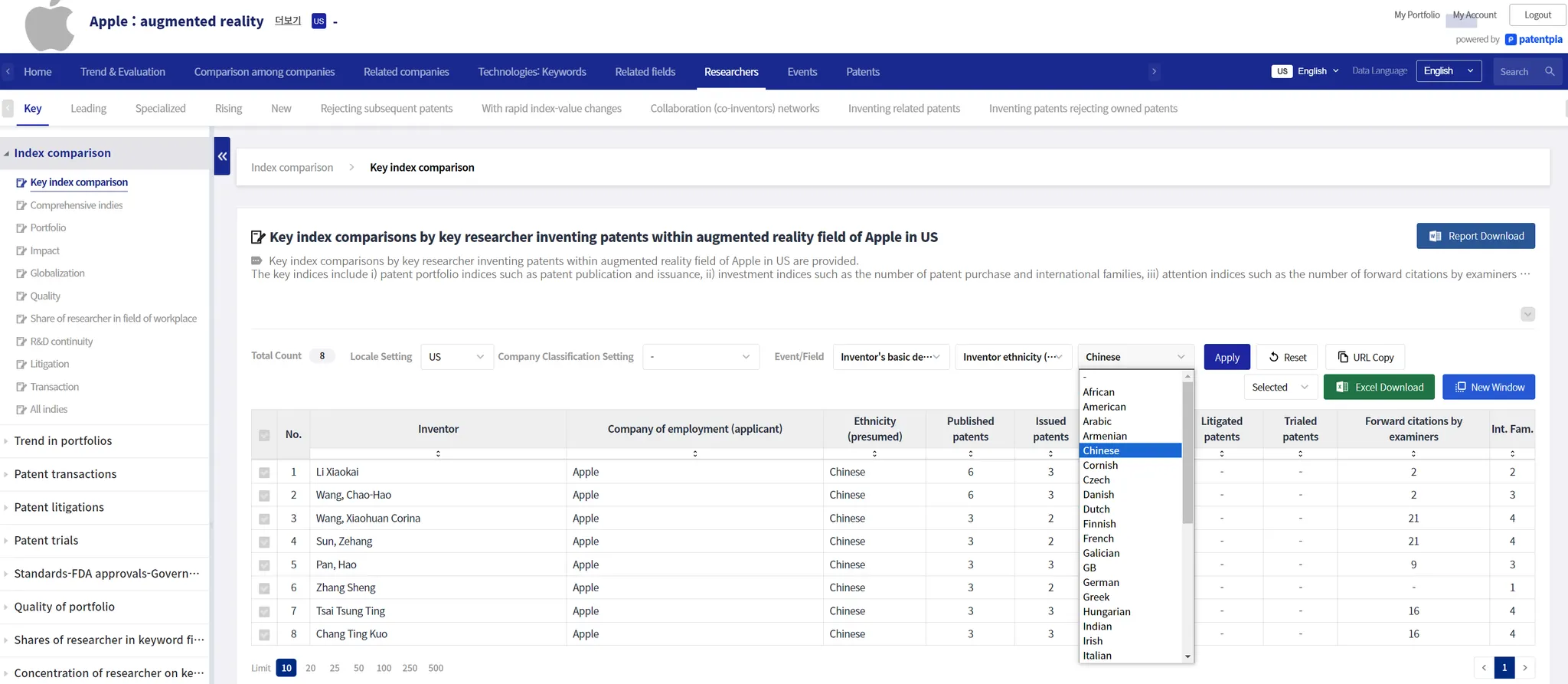 The page below is an analysis result page of researchers (inventors) by purpose (for HR, objective performance, researchers at universities/research institutes, etc.) in a specific target (e.g., a company such as Apple, or a technology field such as augmented reality, or a company’s technology field such as Apple’s augmented reality).