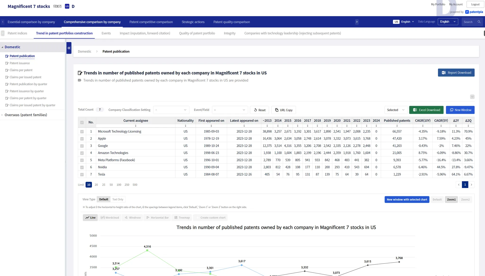 PatentPia GoldenCompass, when you click on an item such as company, technology, researchers, etc., either through search or a link, etc., will provide you with: i) trends analysis, ii) company analysis, iii) technology analysis, iv) researchers analysis for the selected item (e.g., company Apple). Try clicking on one of the many links in the previous sentence.