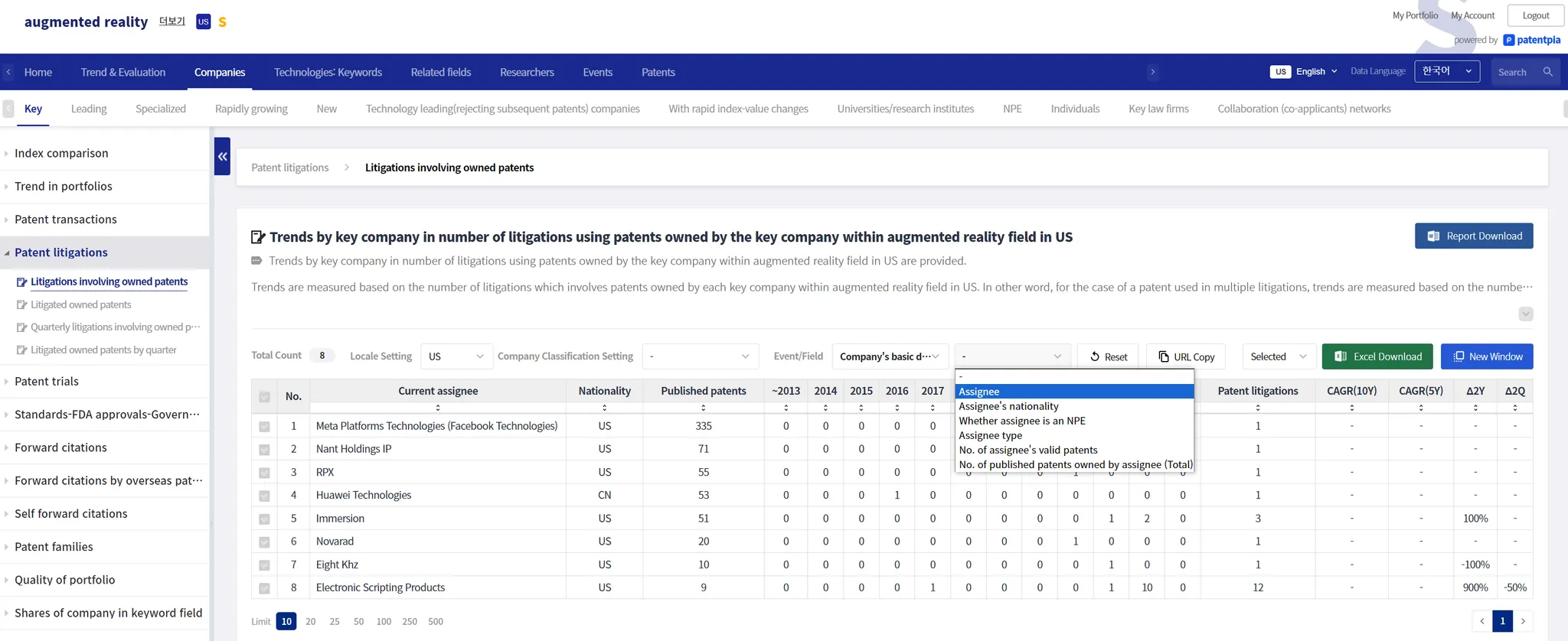 PatentPia GoldenCompass builds measurement and relationship data centered on US/KR/CN/JP/EU. It provides one-click real-time search/analysis/visualization service utilizing the built data. Data for analysis includes technologies, companies, inventors, events (transactions/litigation/trials, etc.), and relationships (e.g., citation/rejection, etc.).