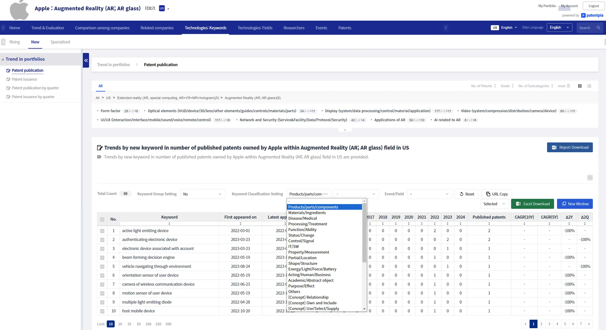 The example below is an analysis result page that explores/senses keywords/concept expressions included in patents of a specific target (e.g., companies such as Apple, or technology fields such as augmented reality, or Apple’s augmented reality field) along with classification.