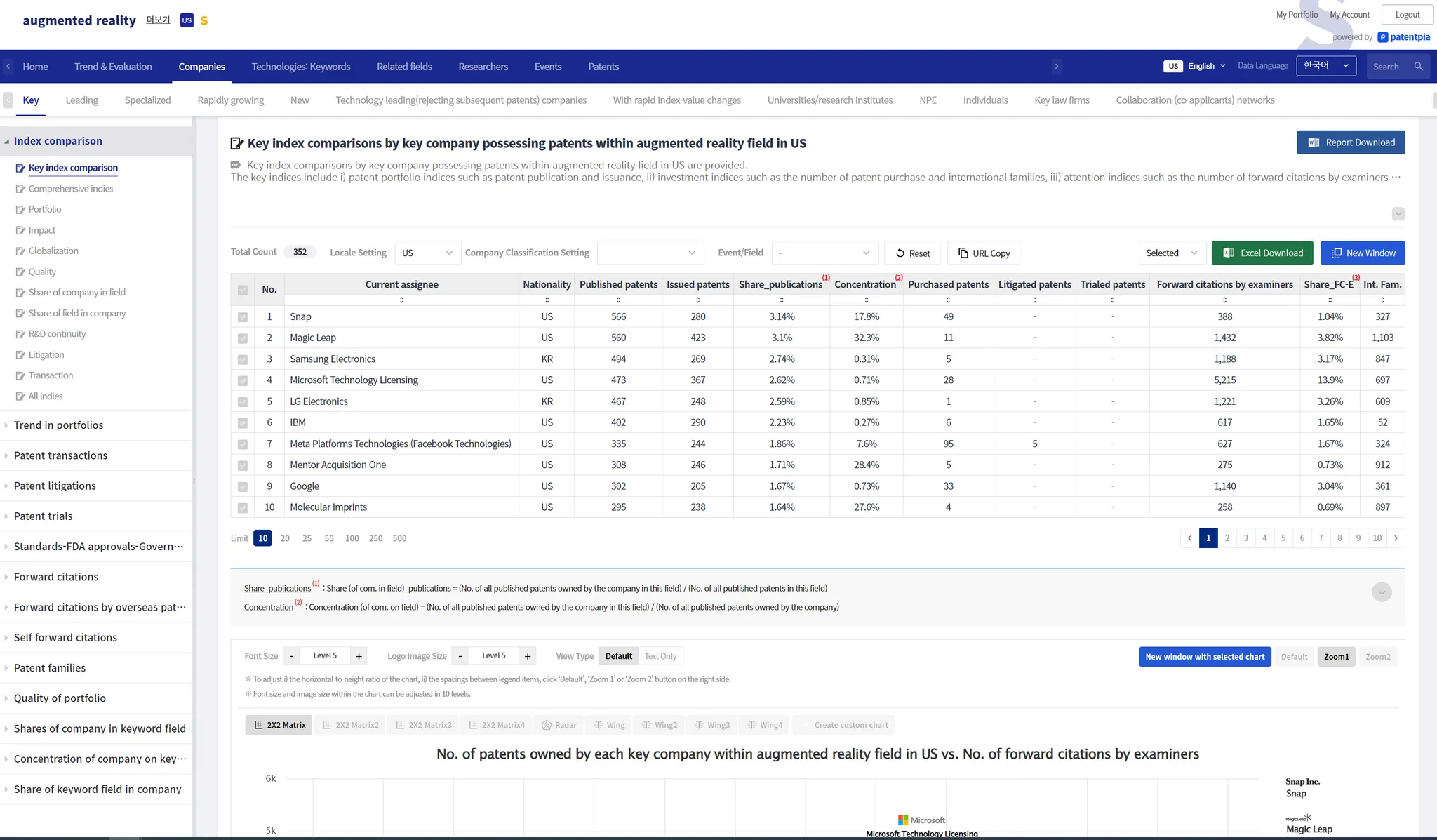The items subject to comparative analysis include i) single items such as companies, fields (technology/keyword/patent classification (CPC/IPC), products, materials, etc.), researchers, agents, etc., and ii) compound items that are a combination of two single items, such as fields of companies.