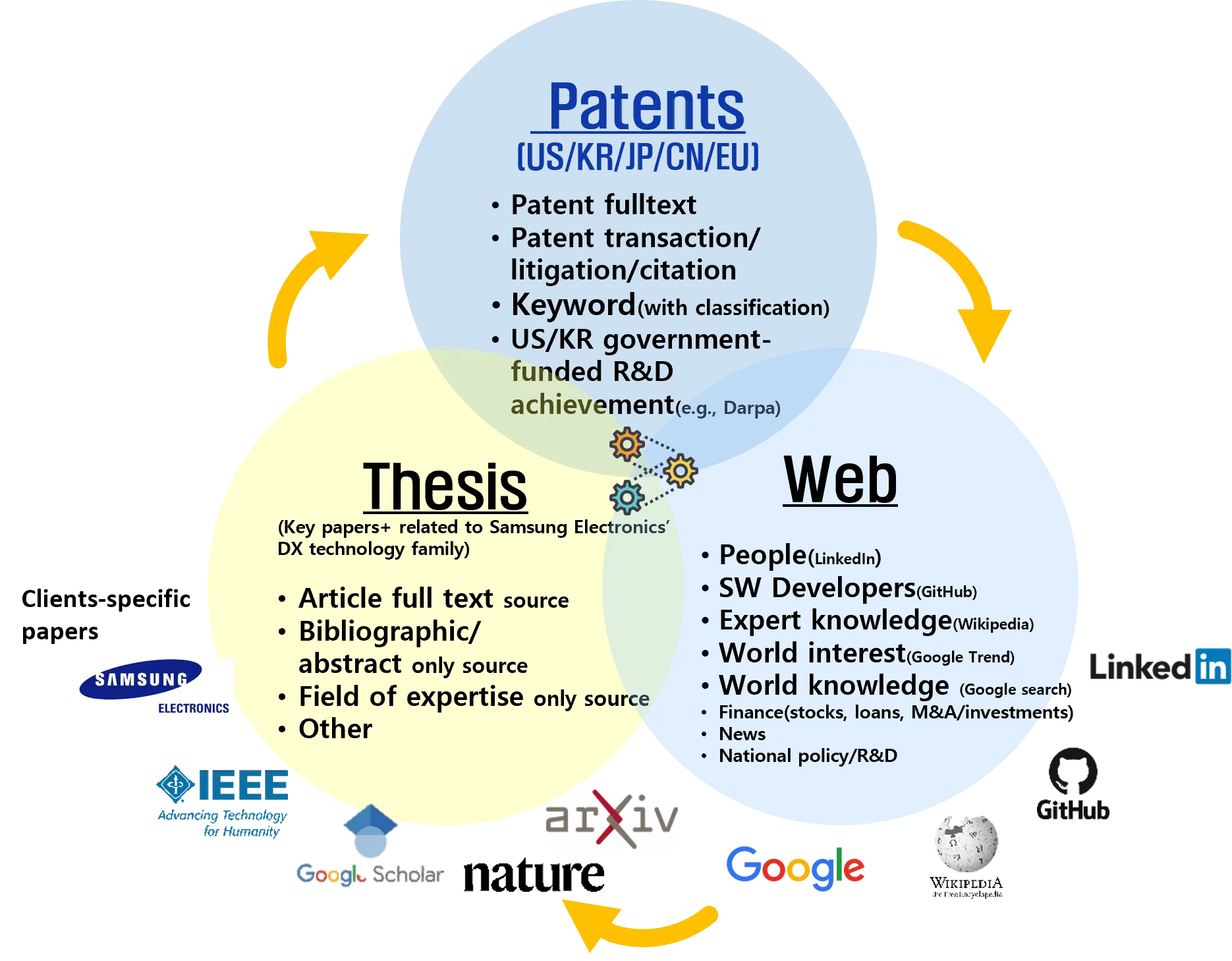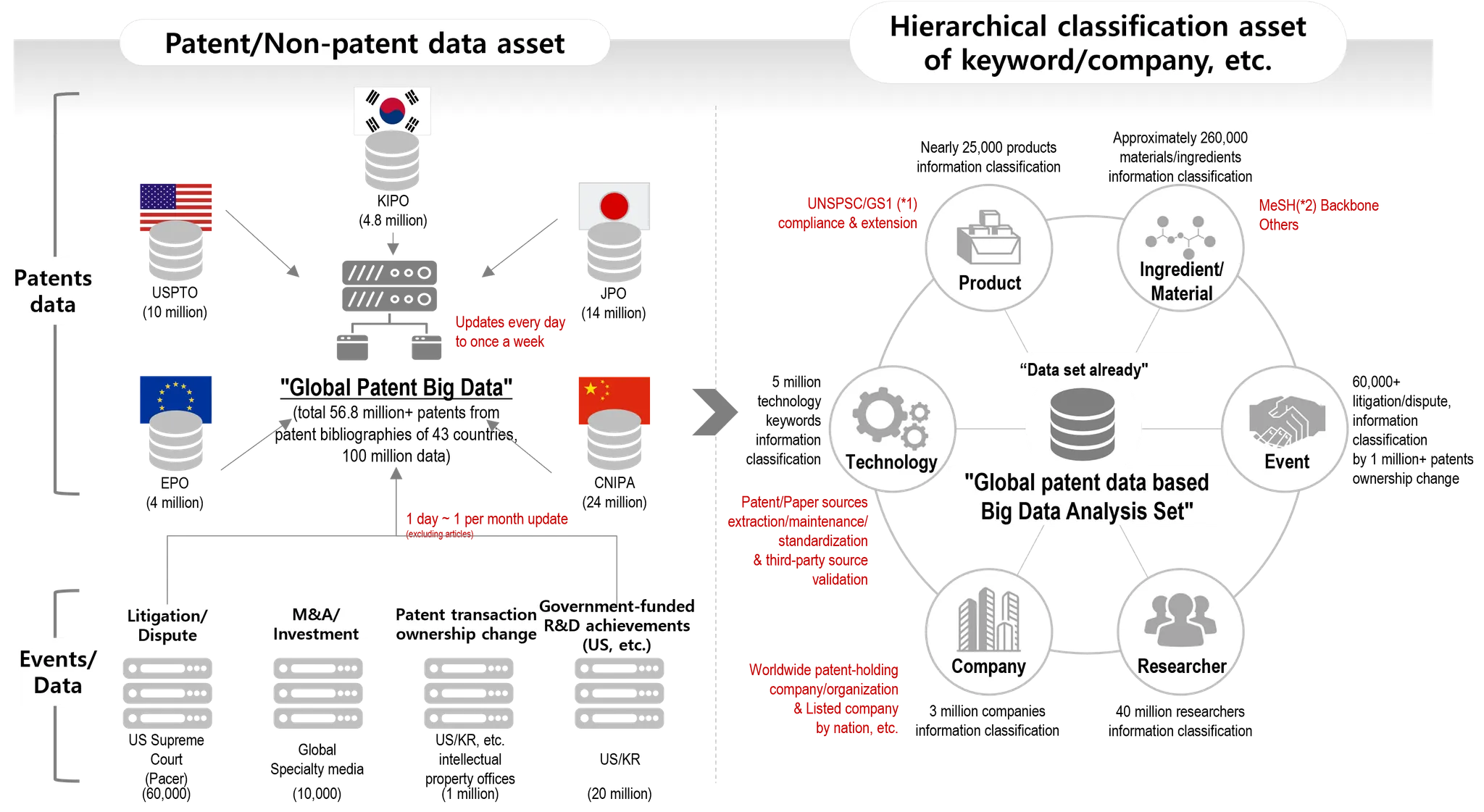 Representative data assets held by PatentPia include i) patent/non-patent data assets, ii) classification assets for keywords/companies, etc.