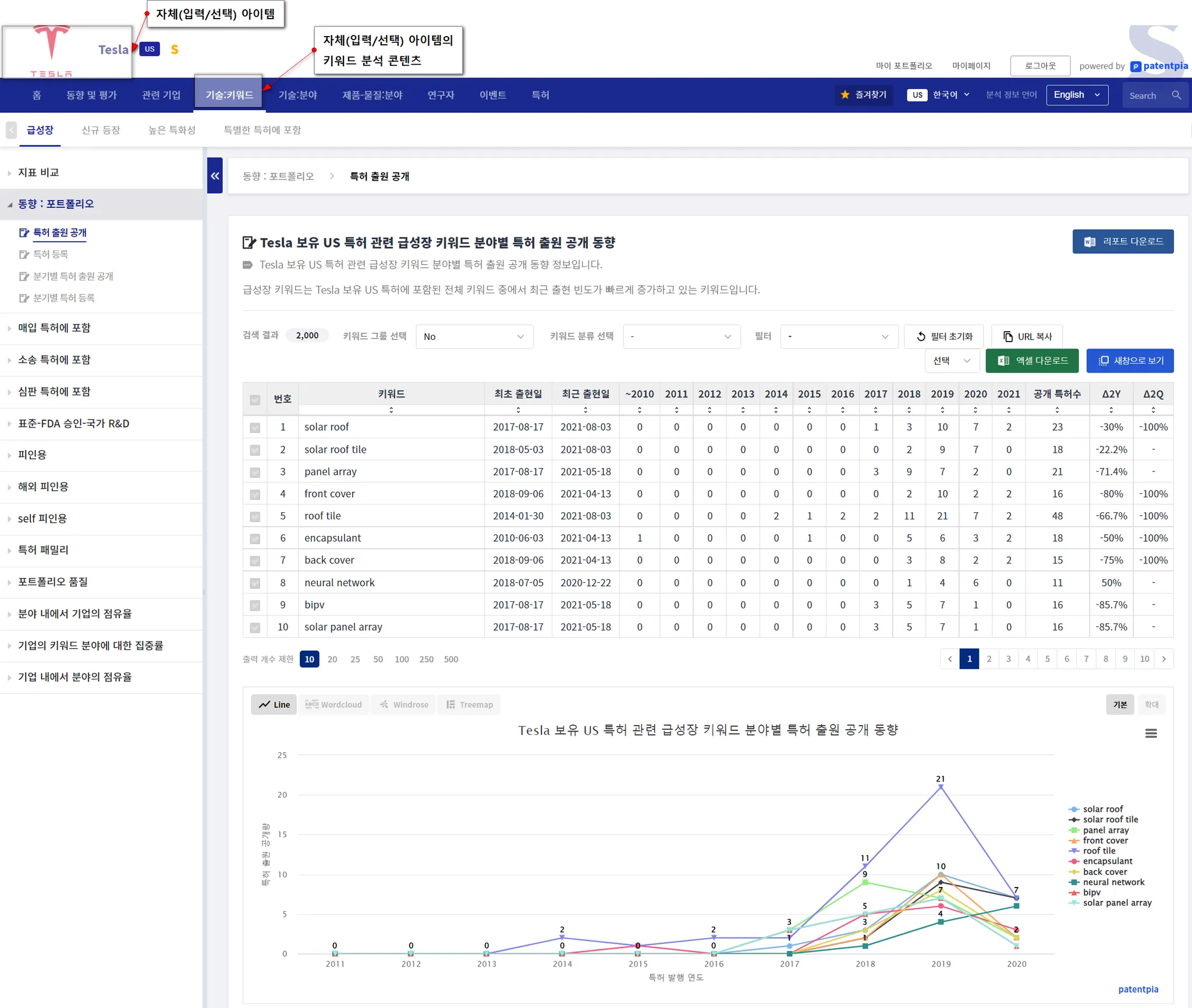 한편, GoldenCompass 페이지로 이동되었기 때문에, GoldenCompass가 제공하는 다양한 다른 분석도 가능합니다. 아래 예시는 선택된 기업의 US 특허 기준 그 특허에 포함된 "급성장 키워드" 분석 콘텐츠입니다.