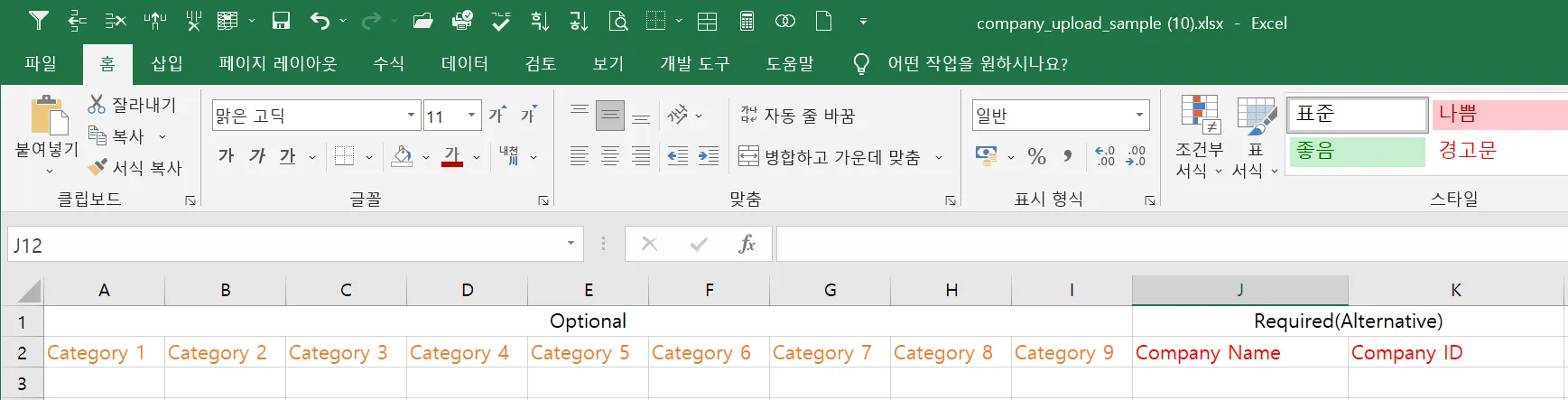 각 엑셀 업로드마다, “Required”로 표시되는 필수 사항이 있습니다. 필수 사항에 “Alternative”가 표시되어 있는 경우, 어느 하나만 입력해도 됩니다.
