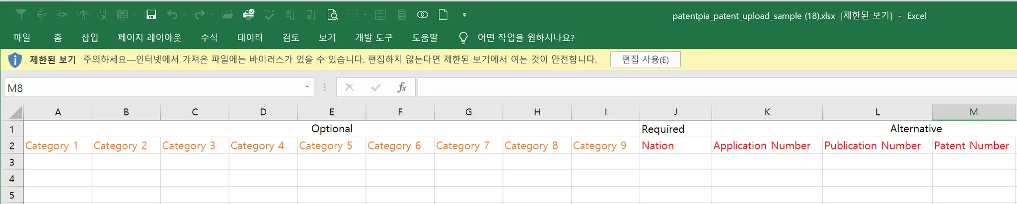 특허 아이템의 등록에 사용하는 특허 아이템 업로드용 엑셀 파일에서는 국가(특허청)과 번호(출원 번호, 공개 번호, 등록 번호, PatentDocID 중 택일)이 필수입니다. 이와 같이, 업로드 아이템마다 필수 항목이 다를 수 있기 때문에, 아이템별로 다른 업로드용 양식 Excel 파일을 사용합니다.