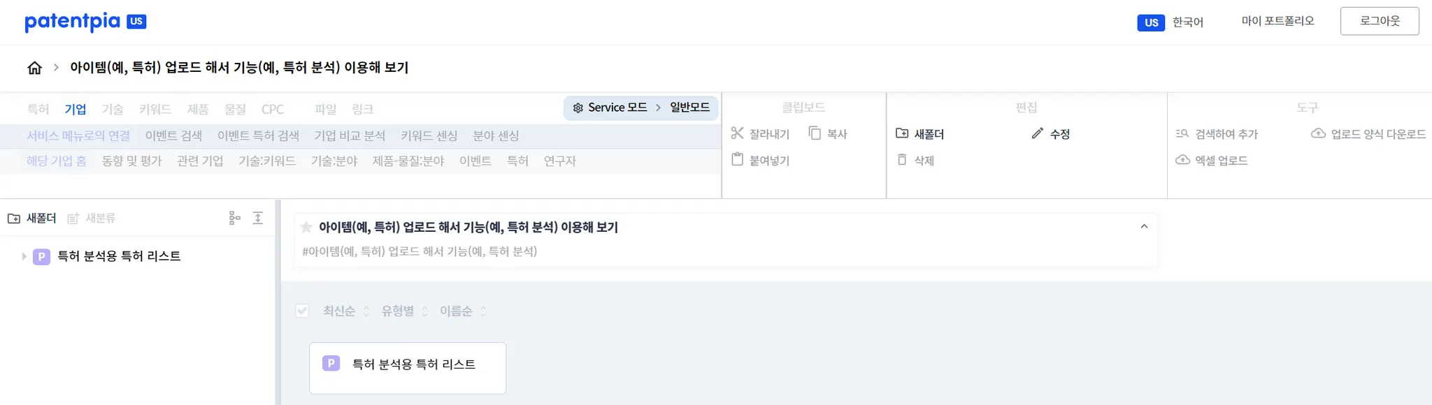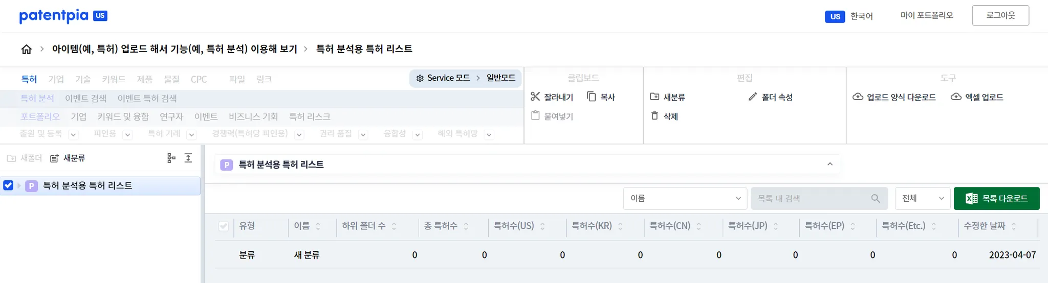 아이템을 담을 폴더 위치를 선택합니다. 위 예에서는 “특허 분석용 특허 리스트”라는 폴더를 선택합니다. 폴더가 선택되면, 오른쪽 ‘도구’ 도구 영역에서 ‘업로드 양식 다운로드’ 또는 ‘엑셀 업로드 메뉴’가  활성화 되어 있다는 것을 알 수 있습니다.