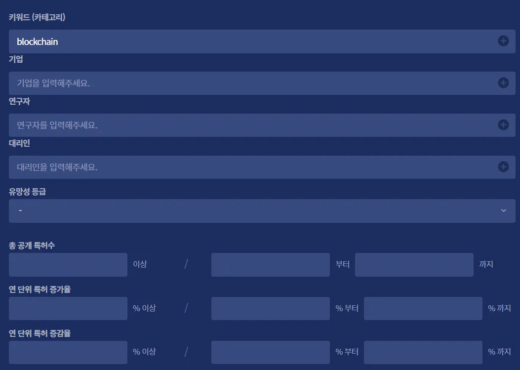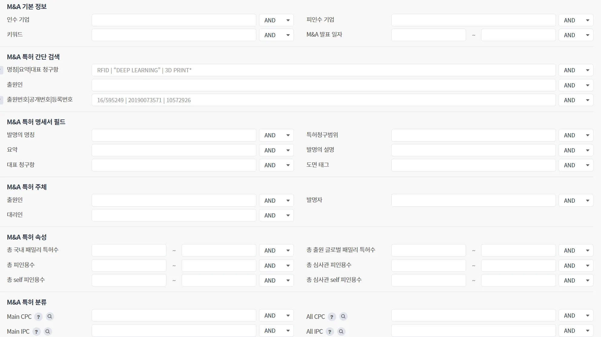 특별한 속성의 특허를 검색하기 위해서는, 검색 결과인 특허 리스트에 댛여, 특허별 속성값을 제한할 수 있어야 합니다. 특별한 속성의 특허를 검색은 “특허 속성” 검색 필드군 하에 있는 다음과 같은 검색 필드를 활용하여 수행됩니다.