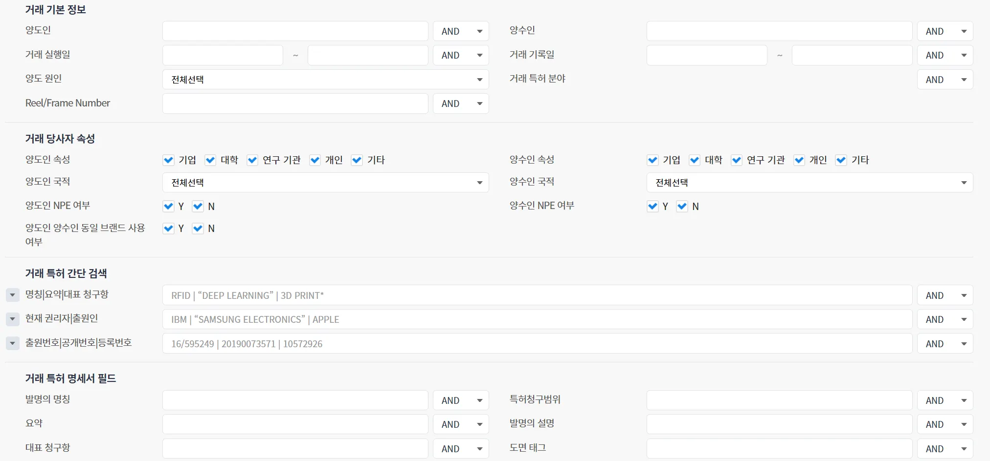 각각의 이벤트마다, 그 이벤트를 잘 검색할 수 있도록 특화된 검색 필드가 있습니다. 아래는 특허 거래 이벤트를 검색하는데 사용되는 검색 필드입니다.