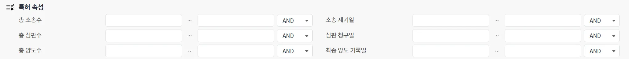 이벤트 관련 특허 검색은, “특허 속성” 검색 필드군 하에 있는 다음과 같은 검색 필드를 활용하여 수행됩니다. 특허 검색의 결과인 특허 리스트에서, 그 특허의 총 소송수가 1 이상이면, 소송에 사용된 특허가 됩니다.
