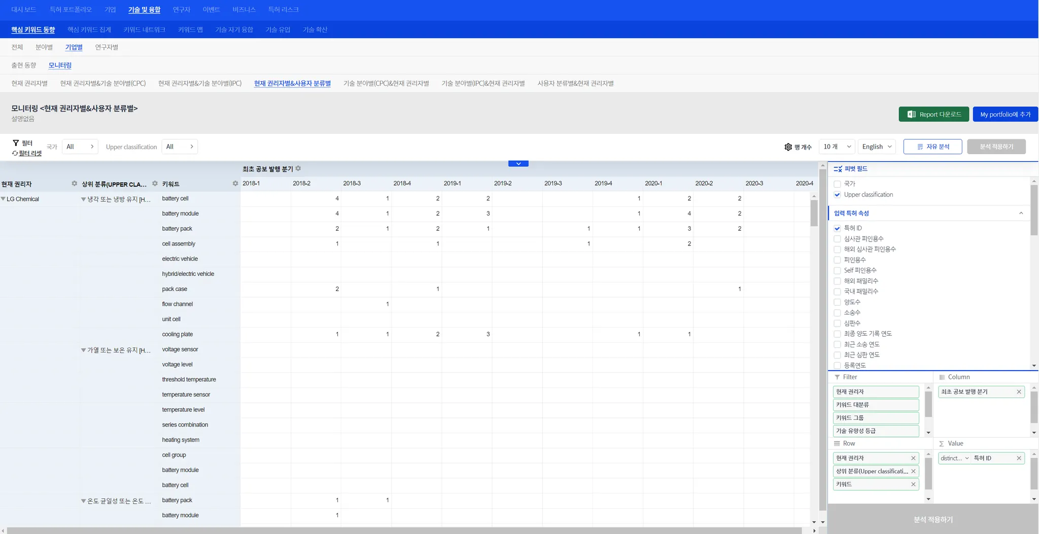 기업별 테크 트리/사용자별 키워드 출원 동향 분석은 테크 센싱 등의 목적에서 널리 활용되는 중요한 분석입니다.