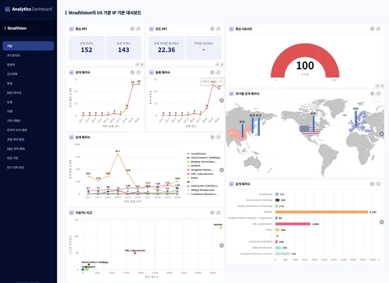 Stradvision이라는 자율주행 자동차용 AI 전문 기업을 예시로, PatentPia GoldenCompass를 활용한 기술 경쟁력 중심의 기업 IR 콘텐츠를 제공합니다. 위 활용 지도의 각 항목에 결합되어 있는 사슬(링크) 표시를 클릭하면, 예시 화면이 새 창으로 열립니다.