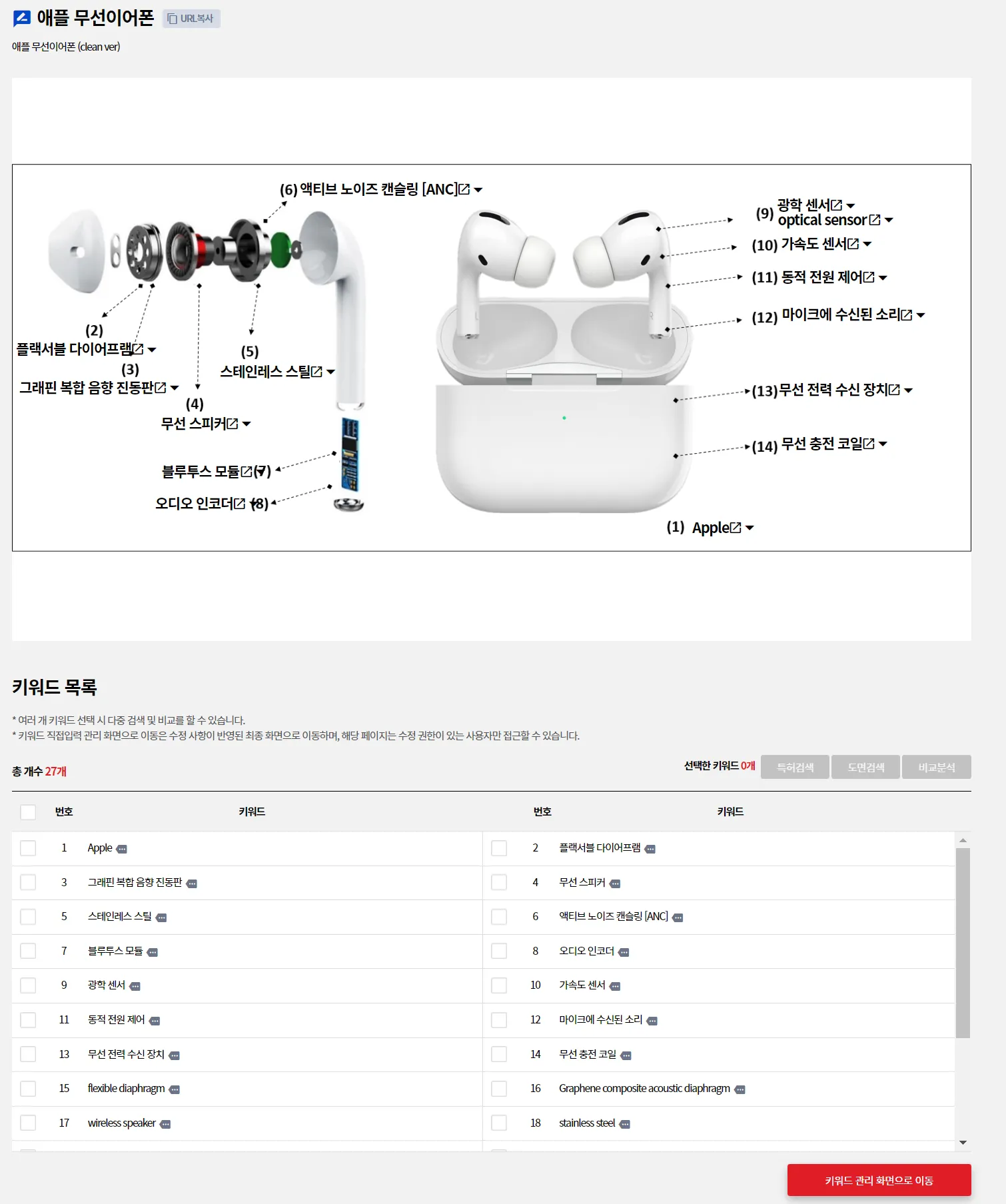 Apple의 무선 이어폰(에어팟)을 예시로, PatentPia ImageMap을 활용 콘텐츠를 제공합니다. 위 활용 지도의 각 항목에 결합되어 있는 사슬(링크) 표시를 클릭하면, 예시 화면이 새 창으로 열립니다.