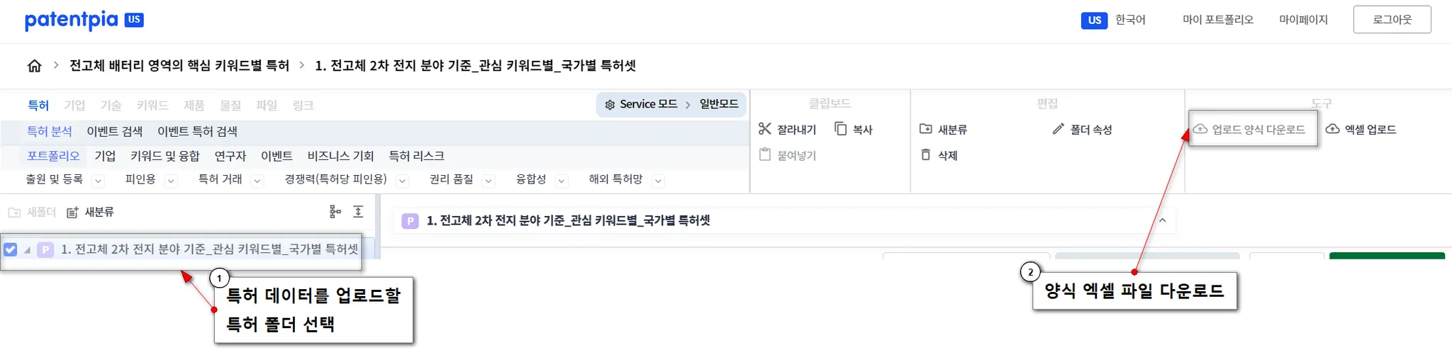 생성한 특허 폴더를 선택하고, 메뉴 영역에서 “엑셀 업로드” 메뉴를 클릭합니다.
