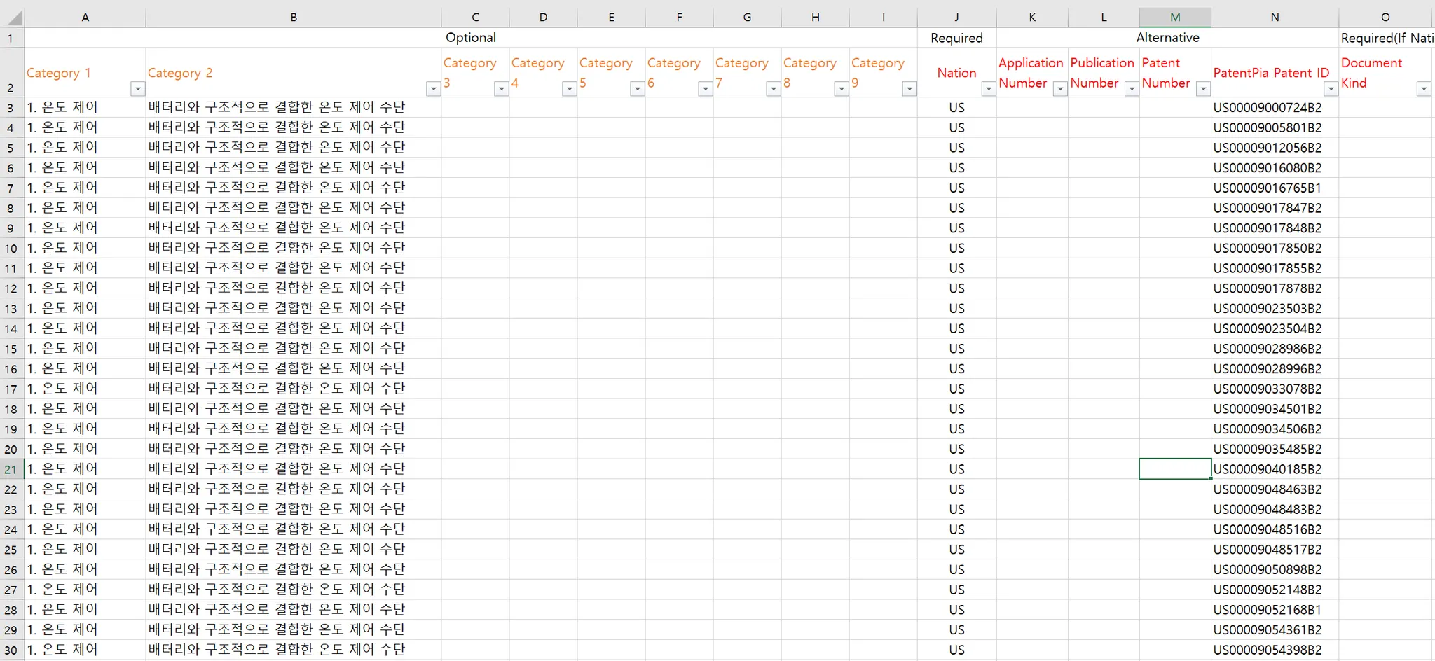 예시적으로 분석을 위한 특허셋 데이터를 준비합니다. 업로드 되는 특허에 대한 정보는 N 칼럼에 있습니다. 그리고, 사용자 분류는 Catetory 1 및 Category 2 필드에 있습니다.
