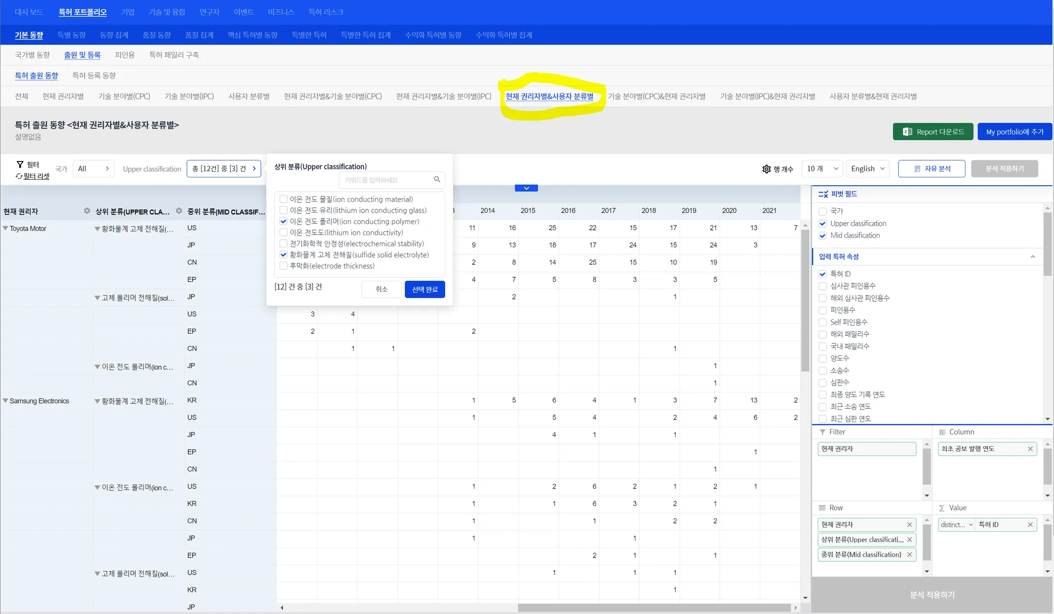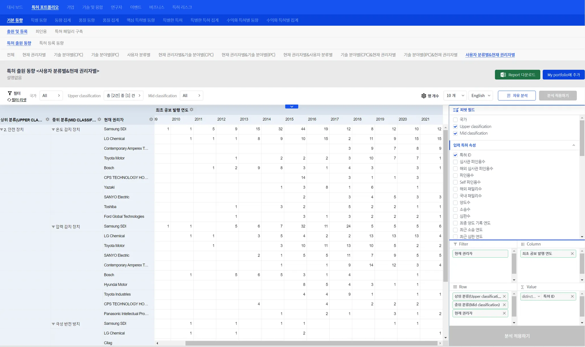 (참고) Analytics에서는 사용자 분류를 3 depth를 default로 설계되어 있습니다. 이 때문에, 사용자 분류가 2 depth로 된 특허셋이 업로드 되면 “(blank)”가 나타납니다. 이러한 문제는 곧 개선될 것입니다.(coming soon) (참고) “(blank)”를 없애는 방법 : i) “자유 분석” 클릭 → ii) 우측 하단의 “Row” 영역에서 “하위 분류(lower classification)” 삭제(”X”를 클릭하면 됨) → iii) “분석 적용하기” 버튼 클릭