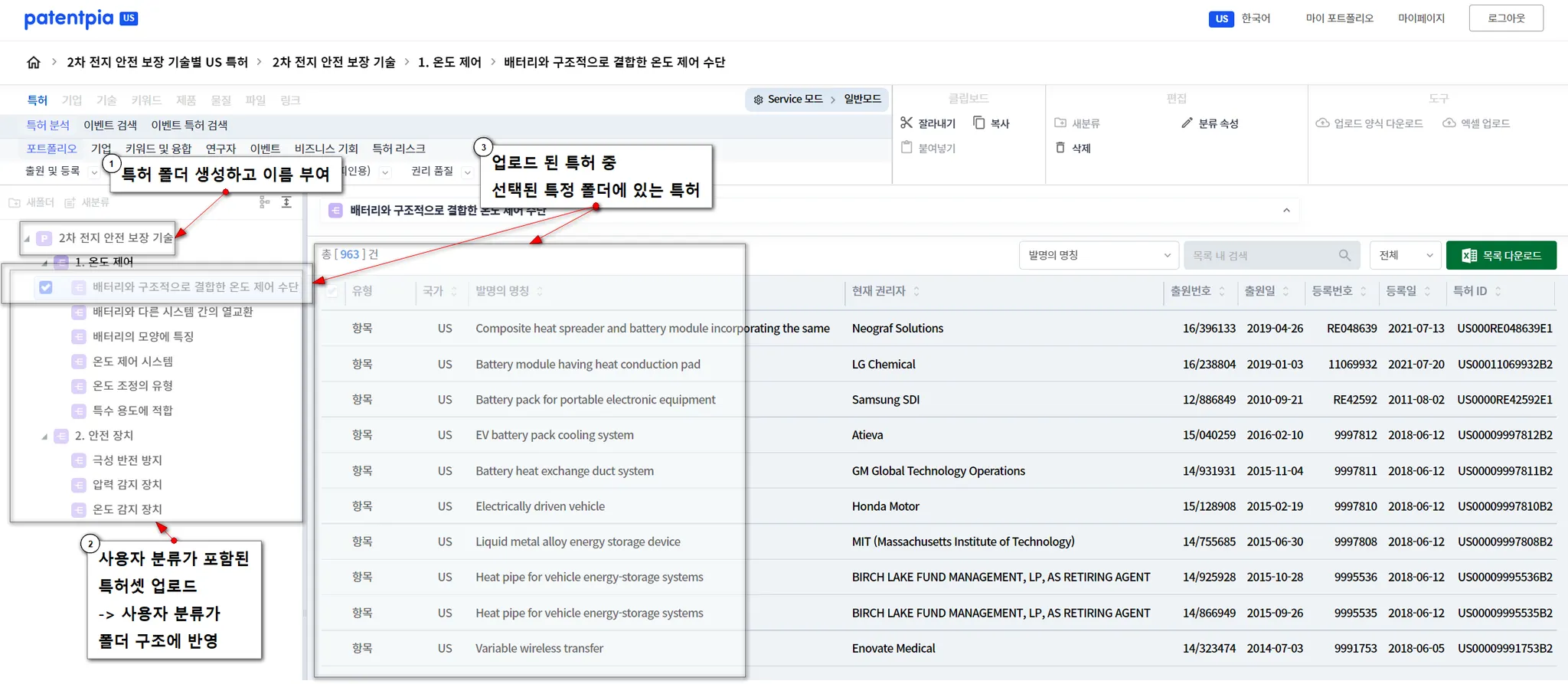 특허셋을 My Platform에 업로드합니다. 사용자 분류가 폴더 구조로 반영되어 있음을 확인할 수 있습니다. 목적하는 사용자 분류에 대응되는 특정 폴더를 선택하면, 업로드 된 특허 중 그 분류에 해당하는 특허가 오른쪽에 나타납니다.