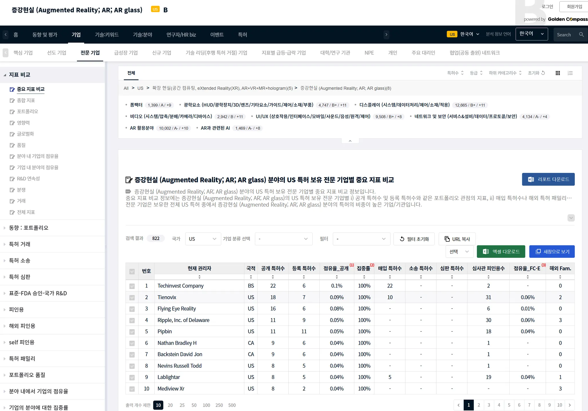아래 예시는 기술 분야의 예시로, 증강 현실(AR, augmented reality)에 집중하고 있는 전문성 높은 기업에 대한 GoldenCompass 화면입니다.