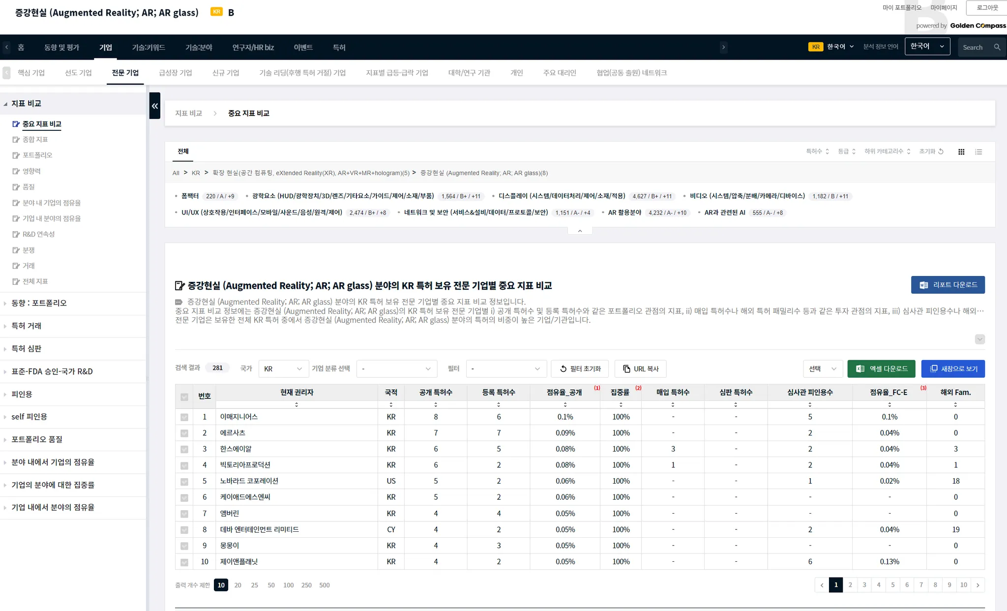 GoldenCompass는 주어진 기술 분야(화면 좌측 최상단에 표시됨)에 대한 전문성 높은 기업에 대한 정보를 ‘기업’ 1 depth 메뉴 밑에 → ‘전문 기업’ 2 depth를 제공합니다. 3 depth 메뉴에서 각 기업별 지표를 비교할 수 있습니다. 지표 비교에서 화면의 모든 기업의 집중률이 100%인 것을 알 수 있습니다. 집중률이 100%라는 것은 이들 기업이 보유하고 있는 특허의 100%가 이 분야의 특허라는 것입니다.