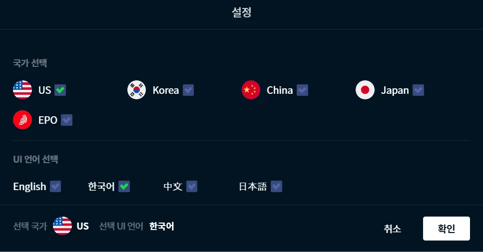 특정 기술 분야의 전문 기업을 다른 나라(예, 미국) 찾기 위해서는 국가만 변경하면 됩니다. 국가 및 언어 선택 UI를 선택(v 표시 클릭)하여, 국가를 US로 변경합니다.