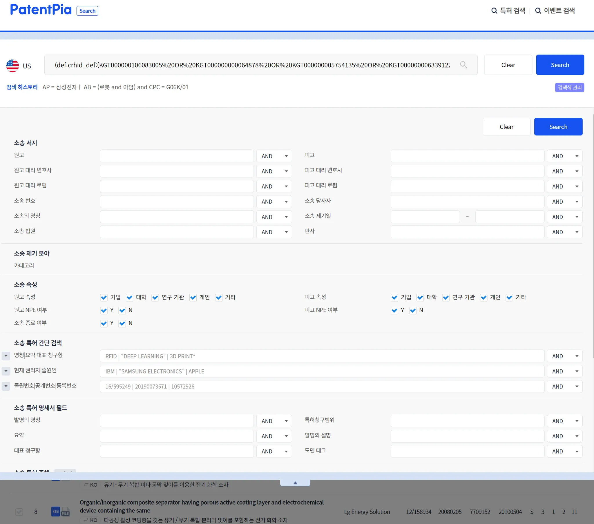 물론, PatentPia Search에서는 다양한 검색 조건을 부가할 수 있습니다. 위 화면에서 상단 영역에 있는 역삼각형 아이콘을 클릭하면, 검색 조건이 입력된 다음과 같은 화면이 나타납니다.