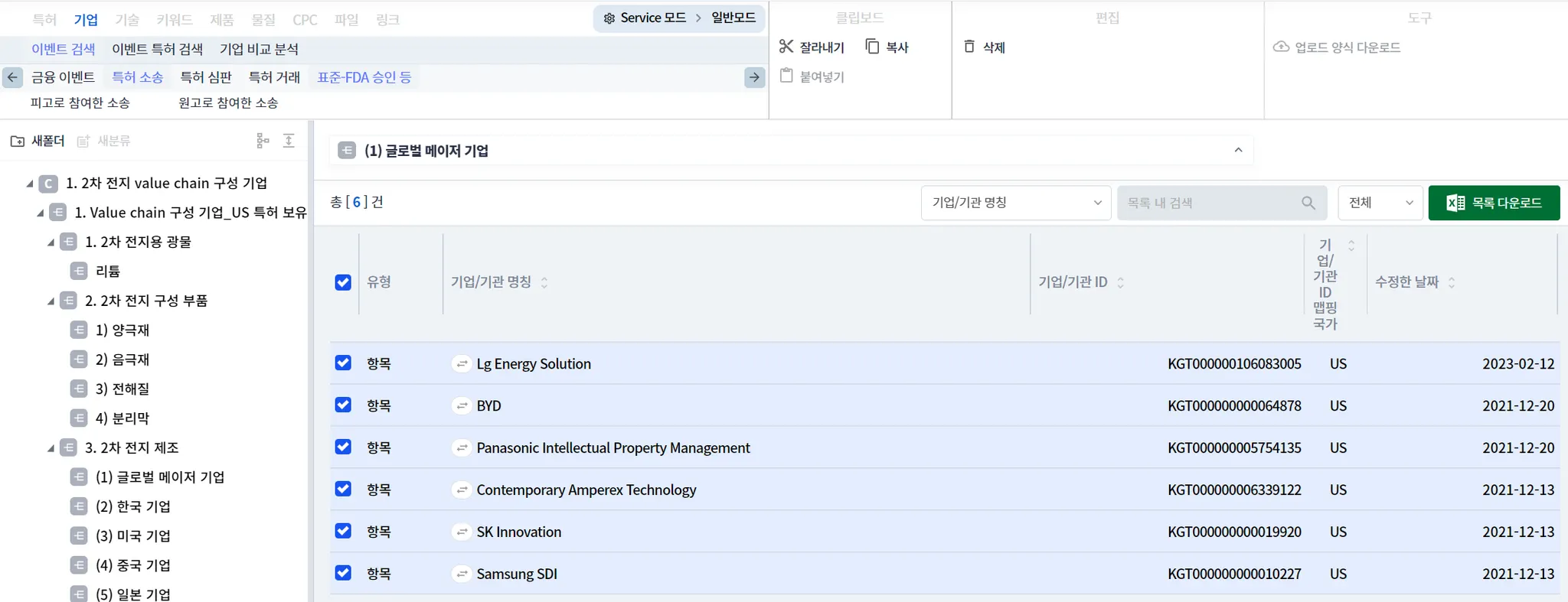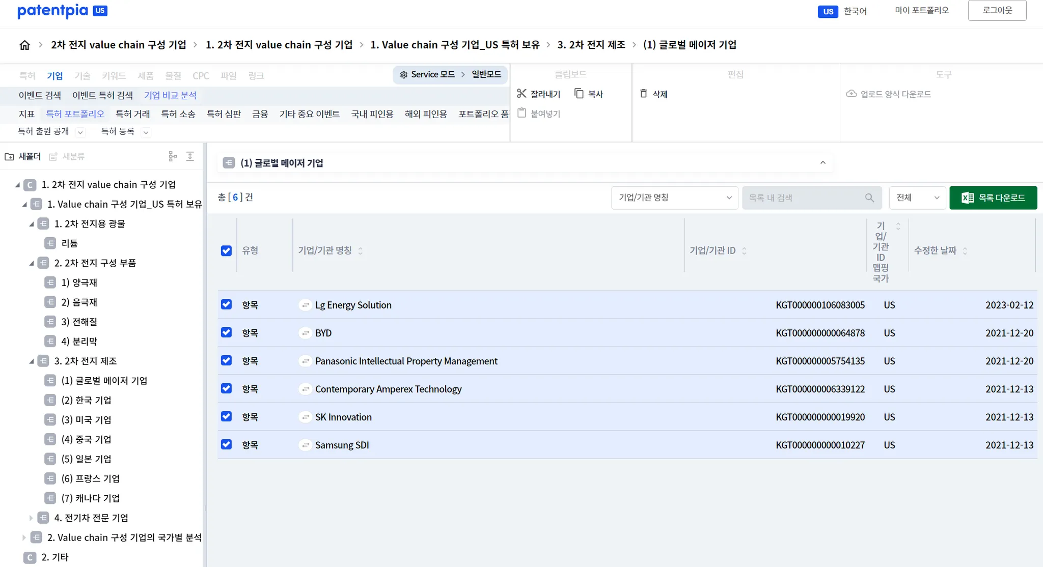 2차 전지 value chain별 각 국가별 기업 리스트를 My platform에 업로드한 결과로 My platform의 관리 기능을 설명합니다.